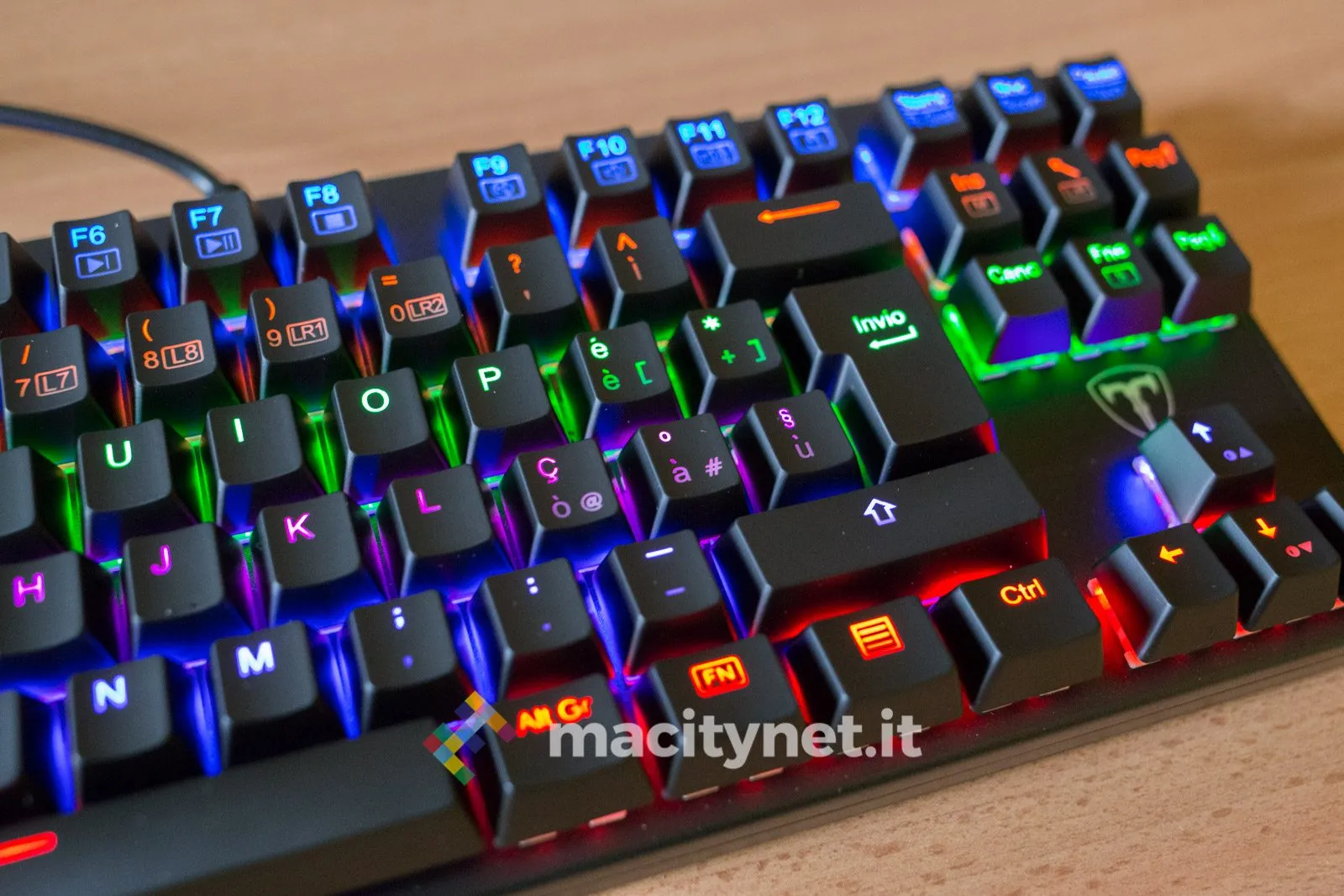 I tasti sono più stretti della tastiera dei MacBook, e hanno un’escursione molto più lunga. Provando a smontarne uno con la pinza inclusa in confezione si scopre che utilizzano un clone dei famosi switch Cherry Blu, caratterizzati da un clic metallico che restituisce l’impressione di una spiccata precisione, tanto che sono i migliori per evitare l’effetto “ghost” (l’effetto che abbiamo quando appoggiamo le dita sui tasti e questi capiscono se il tasto è davvero stato premuto o meno).