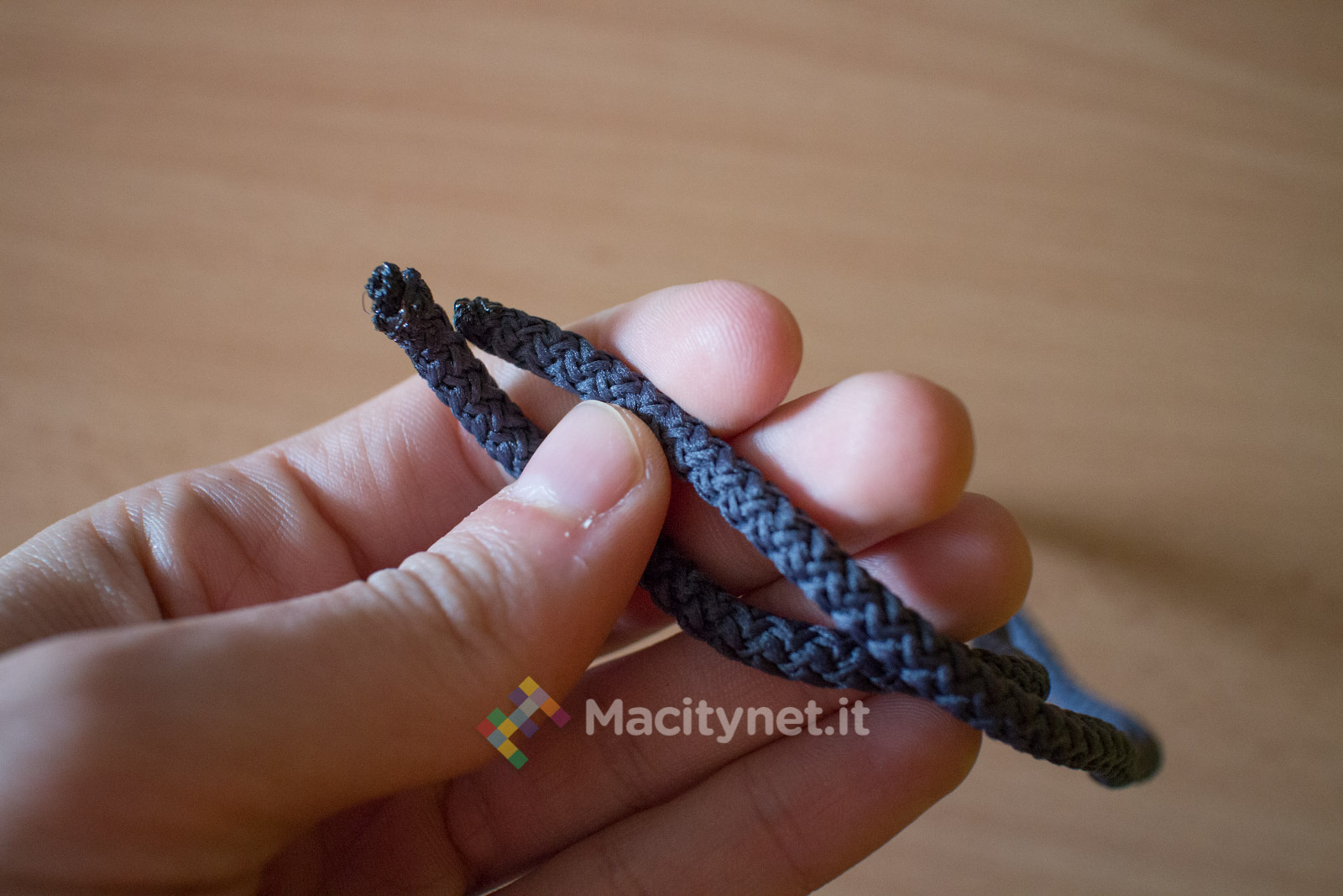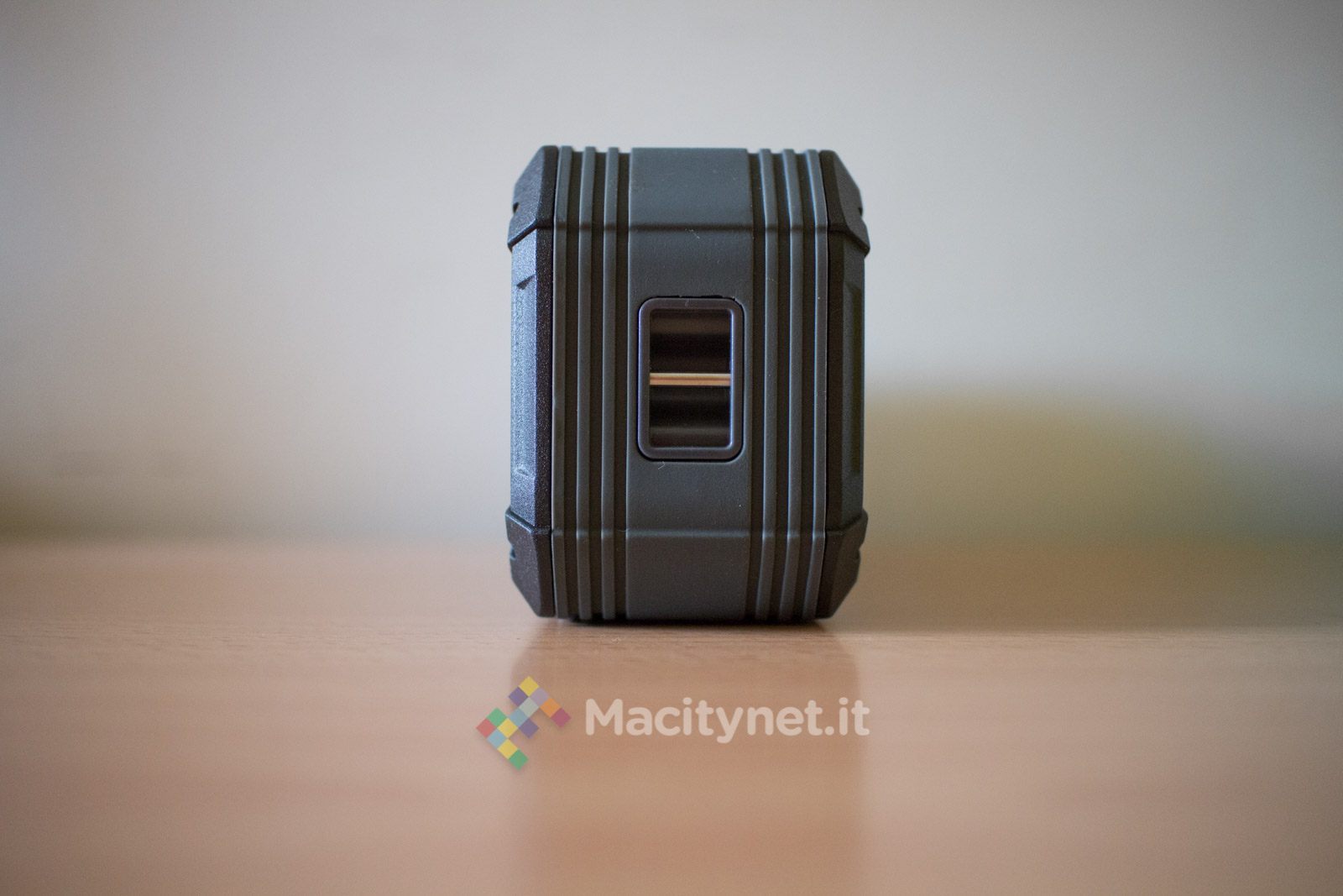 Tutto intorno c’è uno strato di gomma che ricopre gran parte dello speaker, forse a proteggere dagli urti parte della cassa, probabilmente in plastica, che dovrebbe aiutare a ridurre il peso finale. Diciamo “probabilmente” perché l’unica parte effettivamente in robusta plastica che suggerisce questo pensiero è quella ben coperta dallo sportello in gomma dove trovano posto l’ingresso AUX per il collegamento via cavo di un lettore MP3 o un qualsiasi telefono o tablet da cui riprodurre un po’ di musica, l’ingresso microUSB per la ricarica della batteria interna, i 4 LED per conoscere lo stato di energia durante la ricarica ed una presa USB che sfrutta i 5.200 mAh della batteria interna per ricaricare un dispositivo.