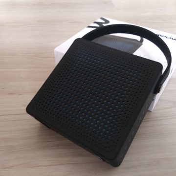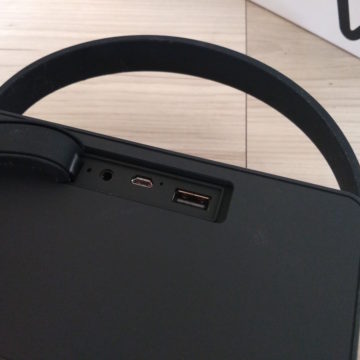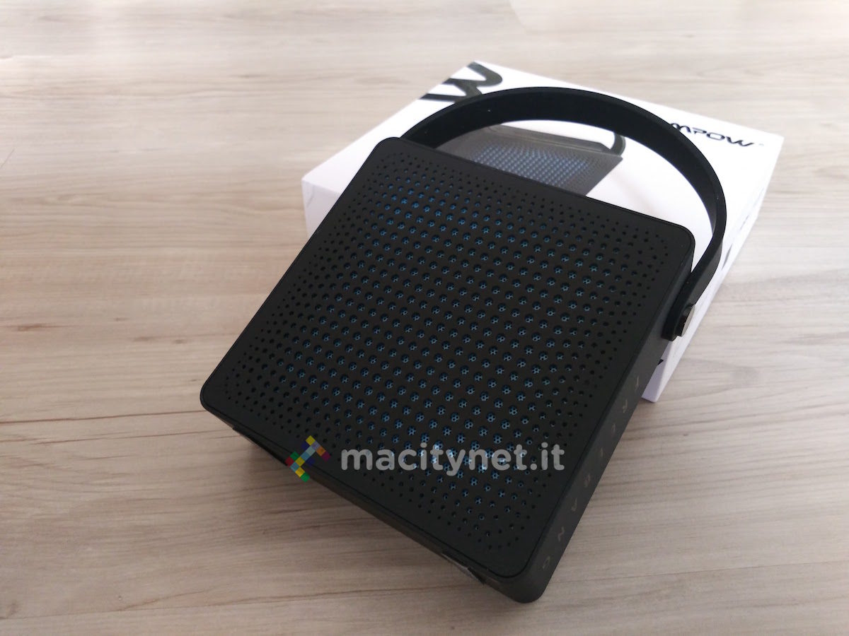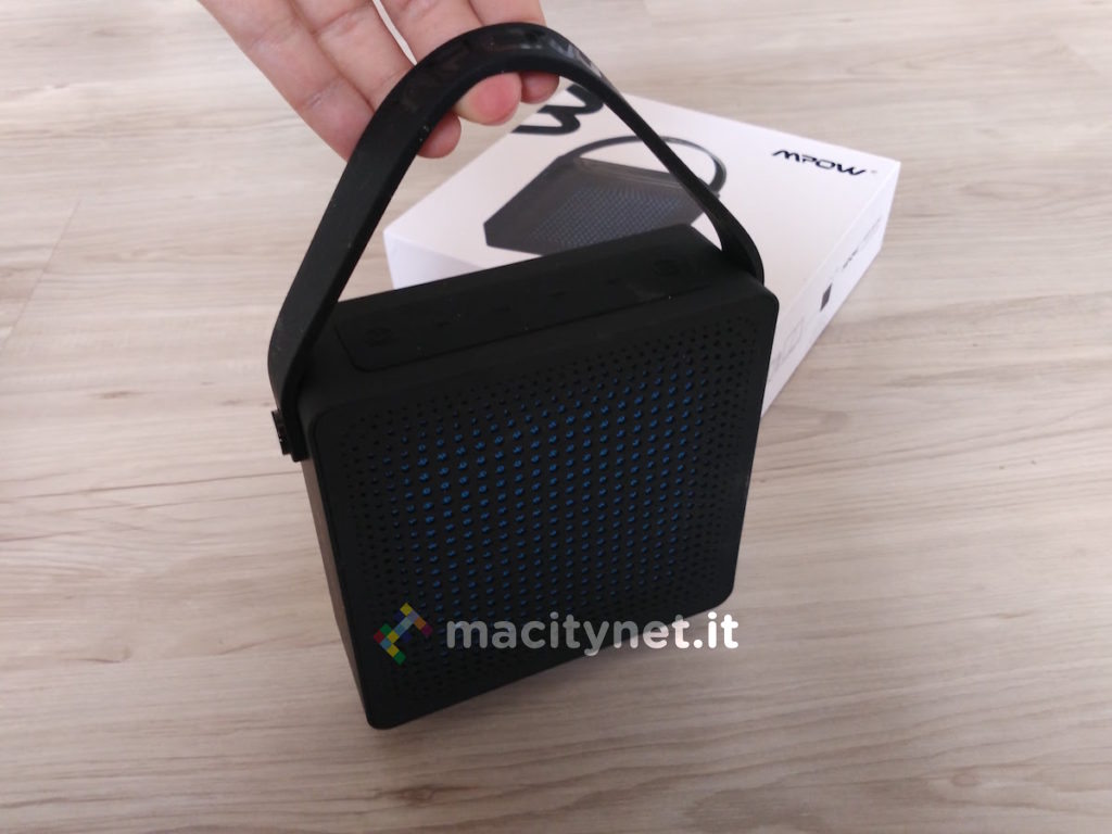 La caratteristica più evidente della Mpow Freebang è la dimensione: misura circa 21,4 x 19,6 x 6 cm e pesa 1,2 Kg. Si tratta di dati che difficilmente è dato leggere su altoparlanti blueooth portatili, ma che mostrano subito i possibili impieghi di questa periferica. Adatta a party all’aperto, magari in giardino o per un utilizzo in spiaggia o a mare sotto l’ombrellone. Grazie ad una maniglia in gomma è facilmente trasportabile, nonostante peso e misure generose, mentre il rivestimento completamente in gomma rende la tenuta piacevole e sicura. Su tutta la superficie frontale spicca la griglia, al di sotto della quale è dato intravedersi uno sfondo blu: una scelta estetica premiante, che rende l’altoparlante piuttosto elegante e dallo stile moderno. Sulla parte superiore sono troviamo pulsanti in gomma, attraverso i quali è possibile abbinare la cassa, aumentare /diminuire il volume e cambiare le tracce musicali. Sul retro, nascosti al di sotto una piccola linguetta in gomma, anche gli ingressi MicroUSB per ricaricare l’altoparlante, un ingresso USB standard per ricaricare dispositivi esterni come smartphone e tablet, e un ingresso jack da 3,5mm per il collegamento wired. L’estetica è, dunque, particolarmente semplice e pulita, e nonostante la cassa non passi inosservata, ha un aspetto gradevole.