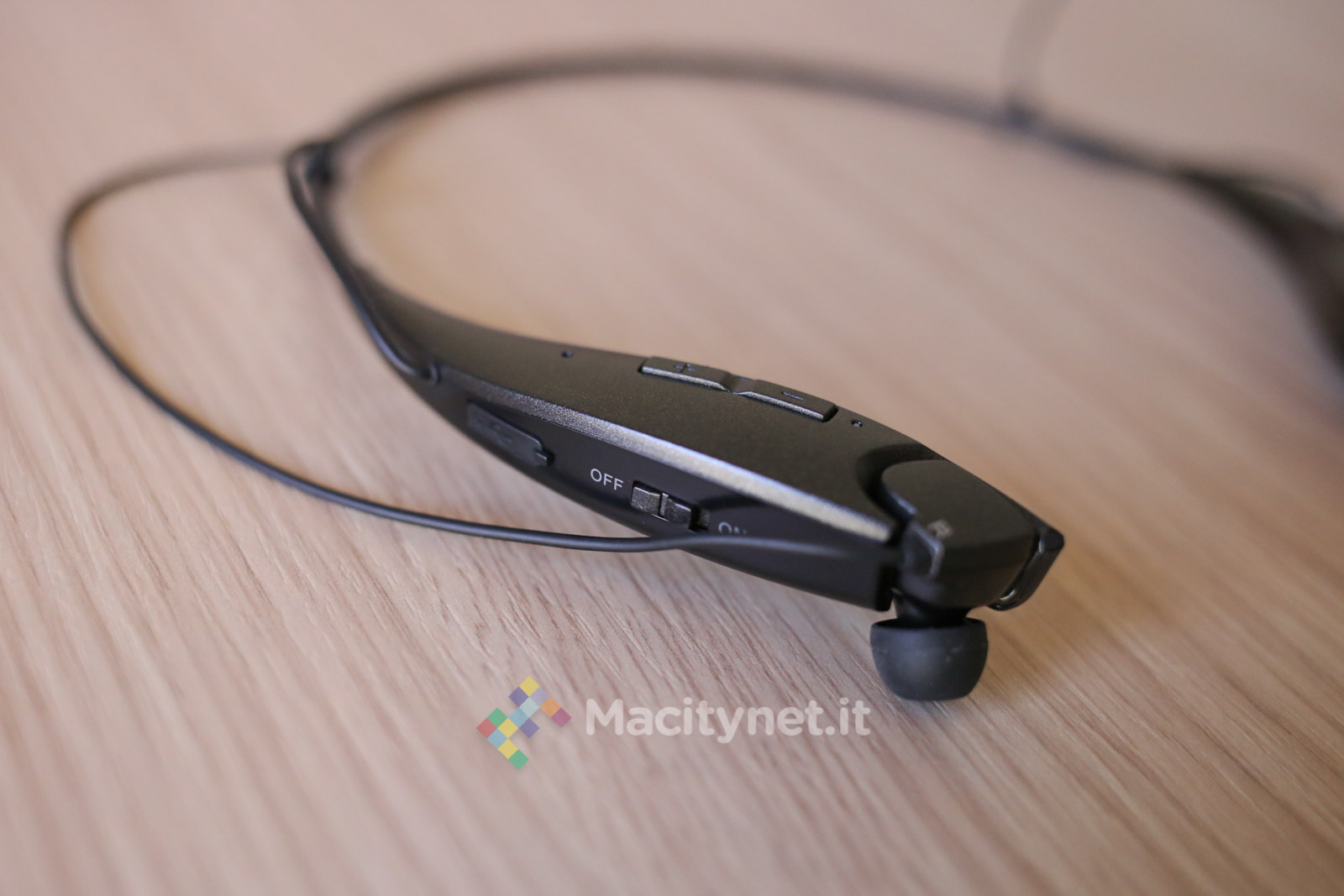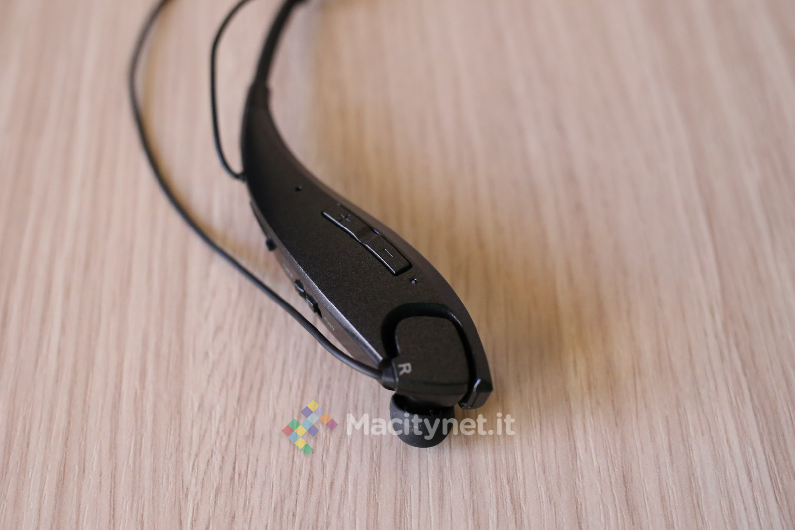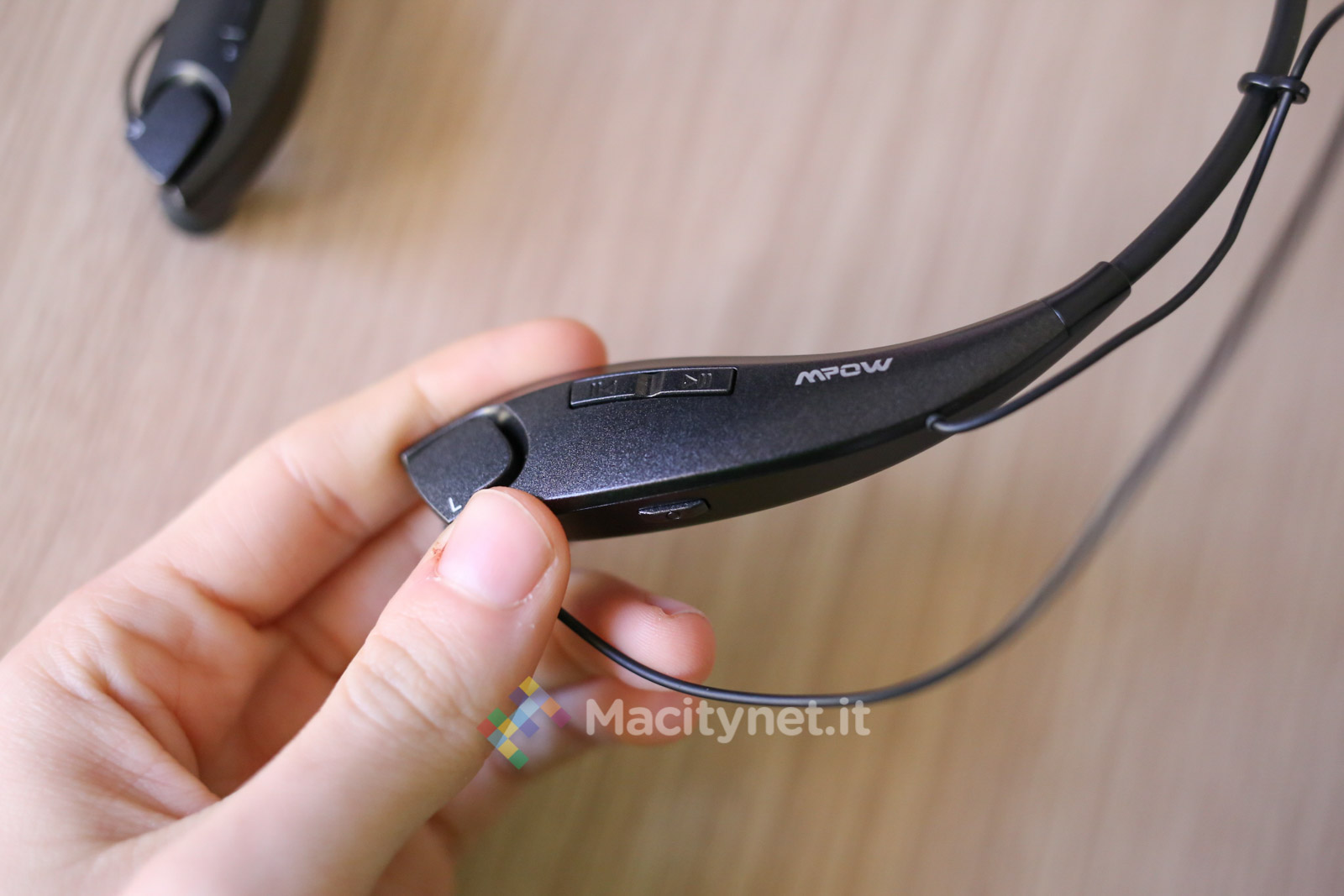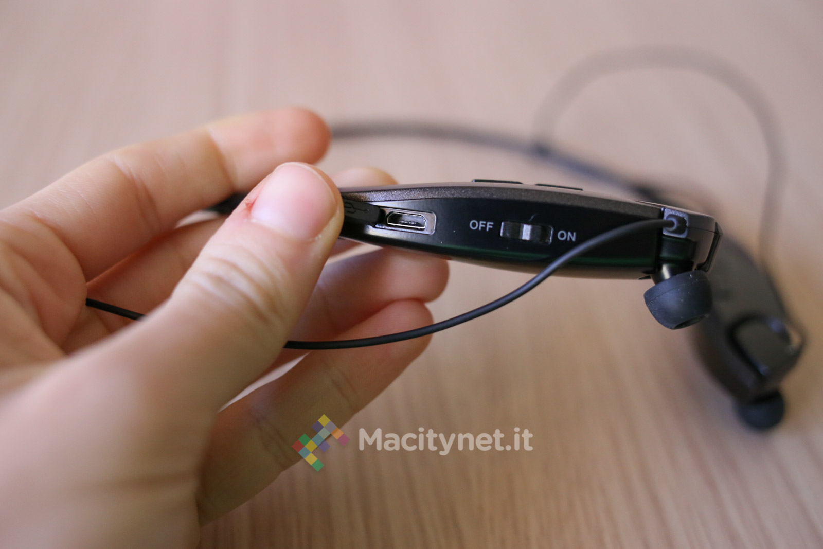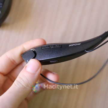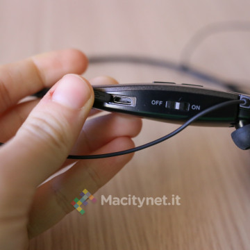 Sull’estremità sinistra dell’archetto, oltre alla cuffietta, trovano posto i pulsanti FWD e BWD, mentre sul lato esterno c’è il tasto Multifunzione. Sull’estremità destra invece, oltre al foro per il microfono, troviamo l’indicatore LED ed i tasti Volume + e -, mentre sul bordo esterno c’è l’interruttore ON/OFF e l’ingresso microUSB per la ricarica protetto da un tappo in plastica gommata.