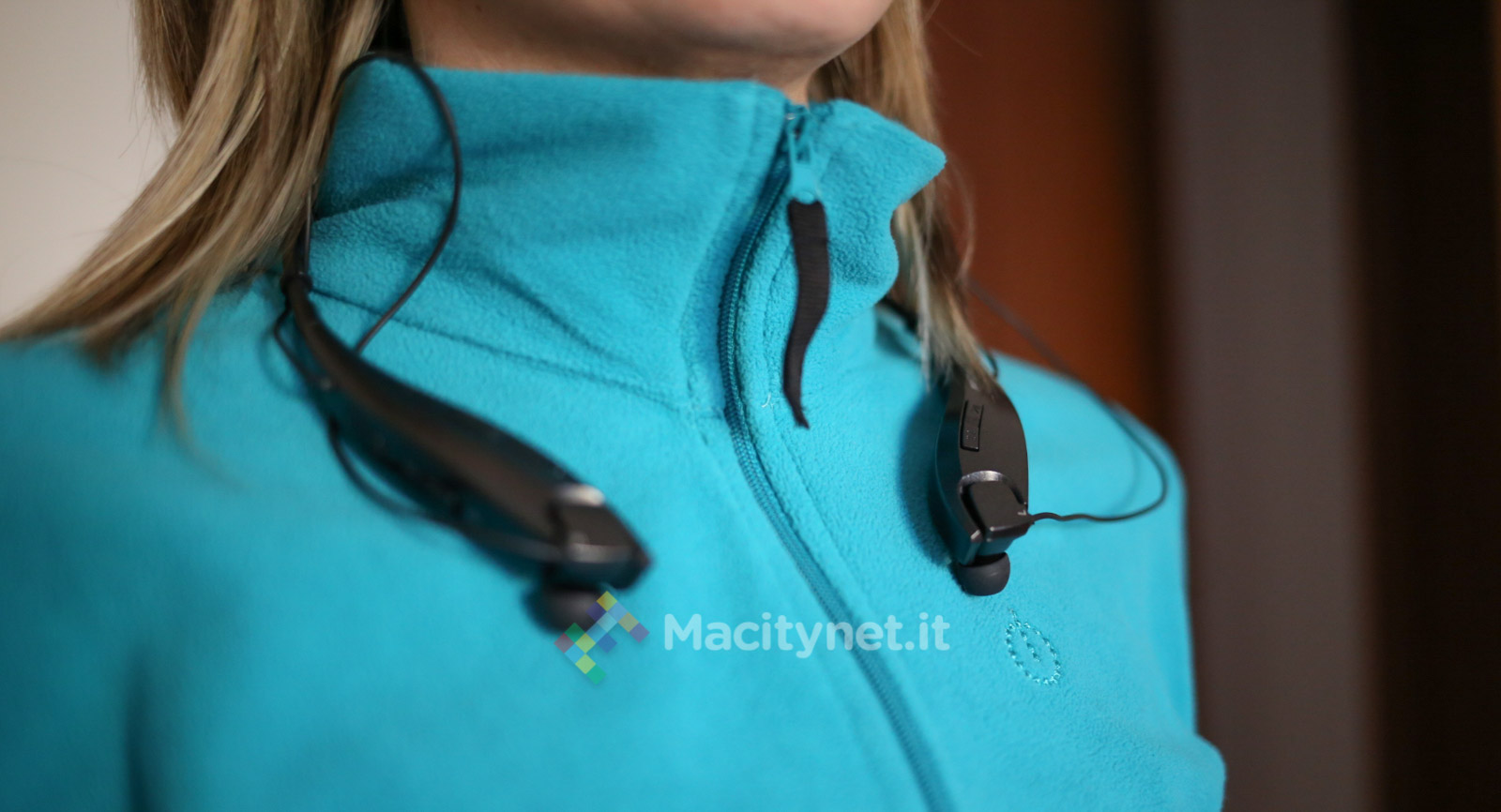 I fili delle cuffie in-ear sono abbastanza lunghi e tenuti in ordine da due clip che scorrono lungo l’archetto, potendo così essere regolati per qualsiasi esigenza senza lasciare cavi eccessivamente penzolanti.