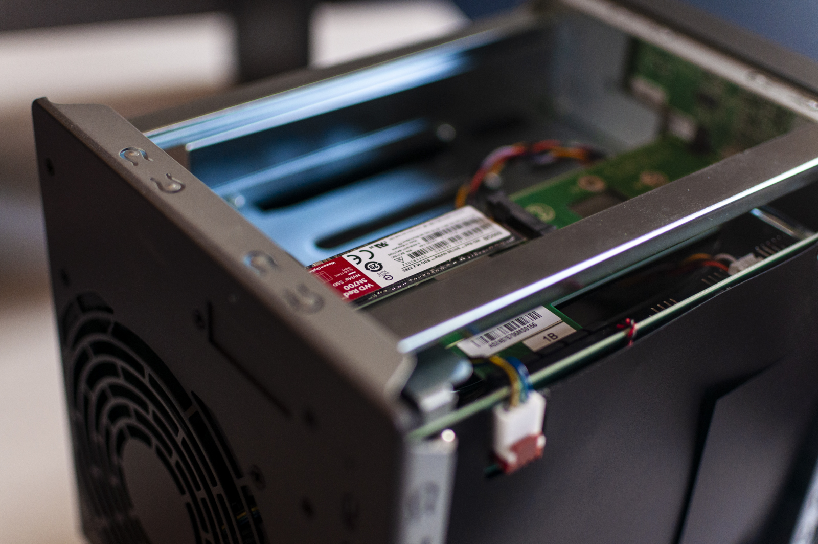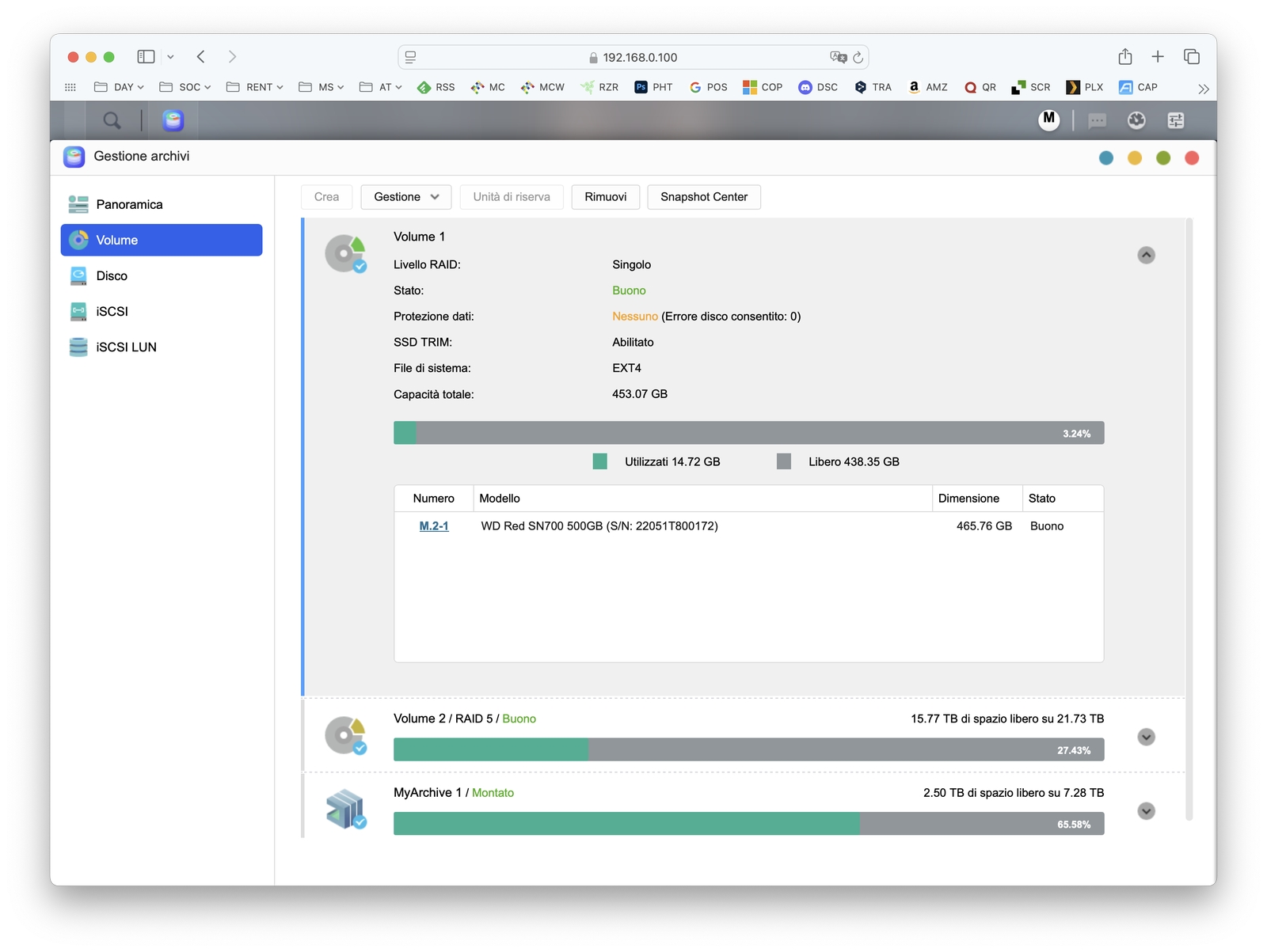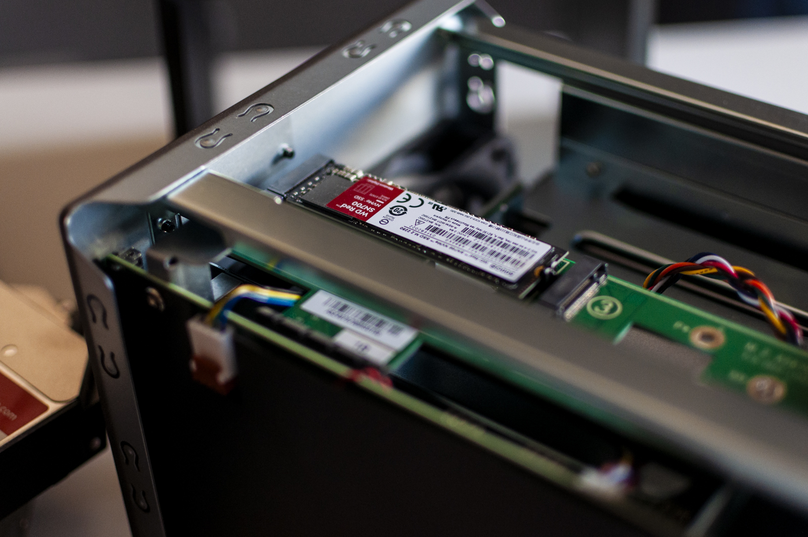 Come raccontato precedentemente, abbiamo optato per un sistema a due volumi meccanici, uno per l’archiviazione pura in RAID 5 e uno per il backup e il trasferimento, più una unità M.2 come volume per il sistema operativo e una seconda unità M.2 per la cache dei dischi meccanici del RAID.
