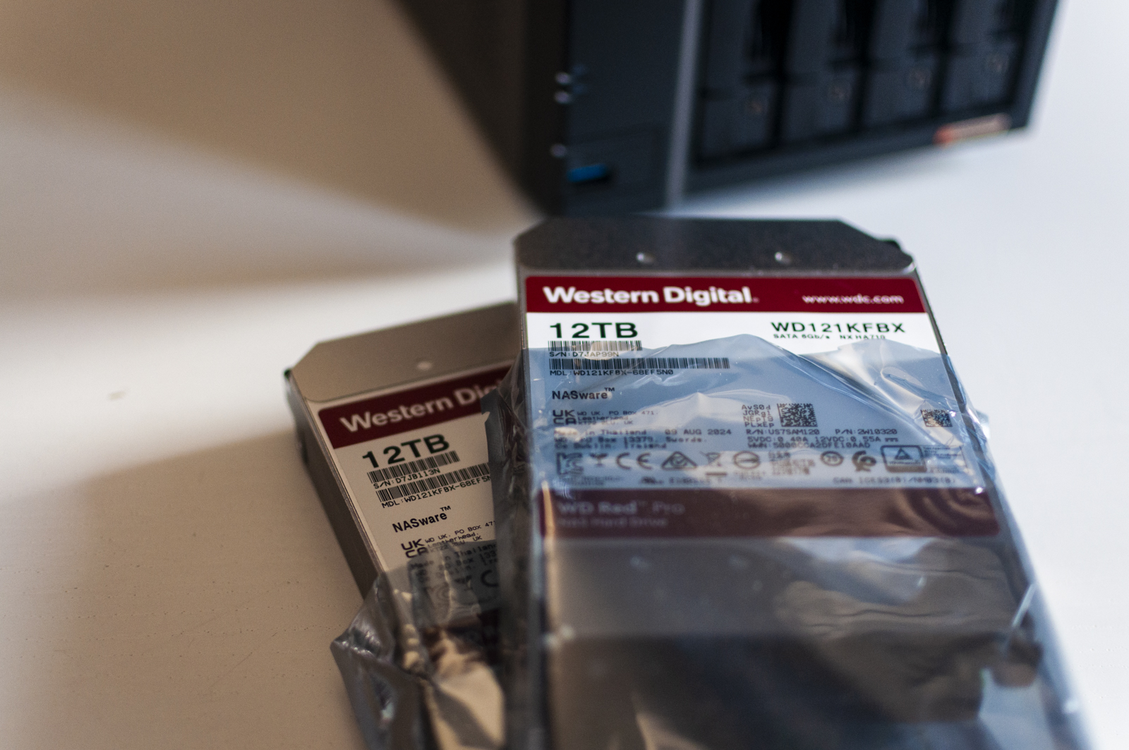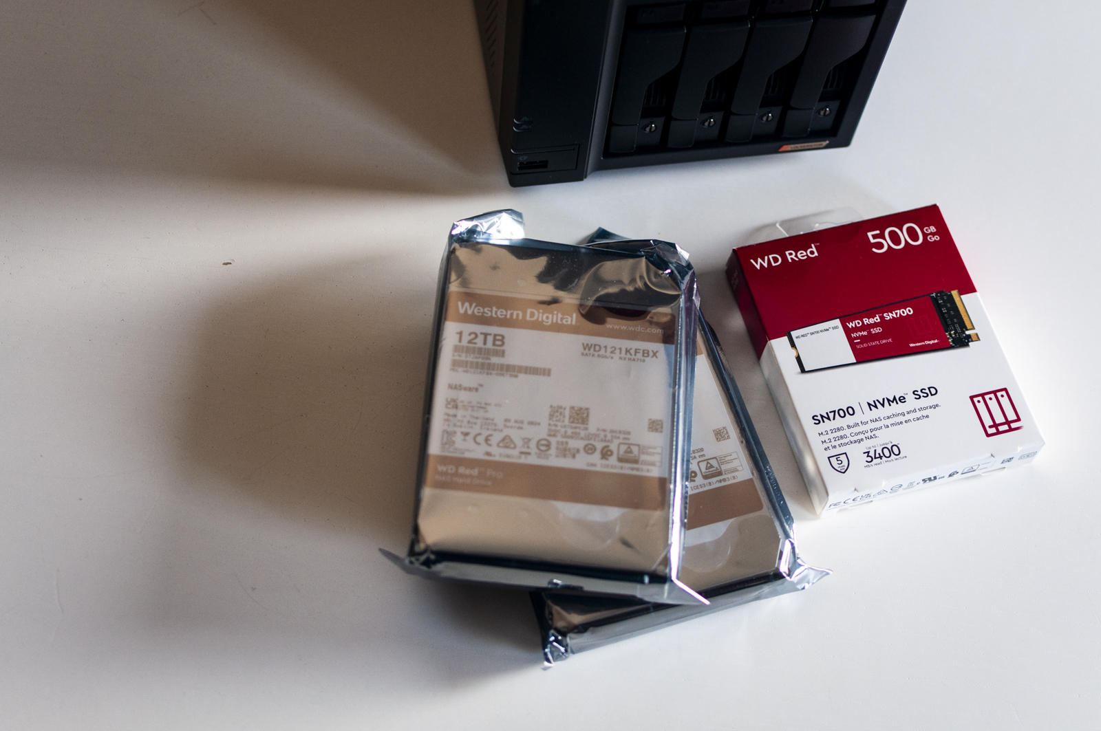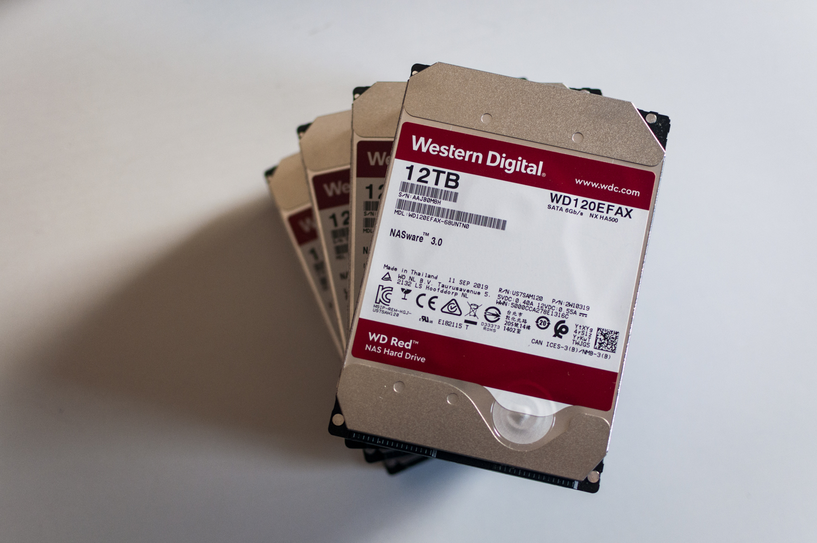 Per le slitte frontali, abbiamo usato quattro dischi meccanici da 3,5” della serie RED da 12 TB, unità pensate proprio per essere usate 24/7 e quindi perfette per un NAS.