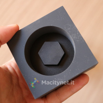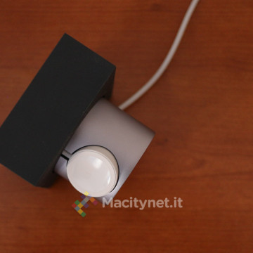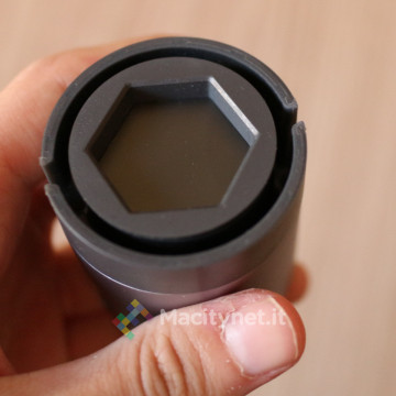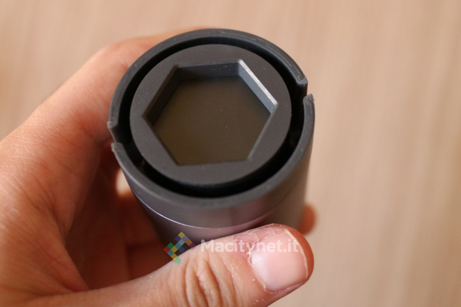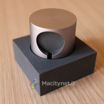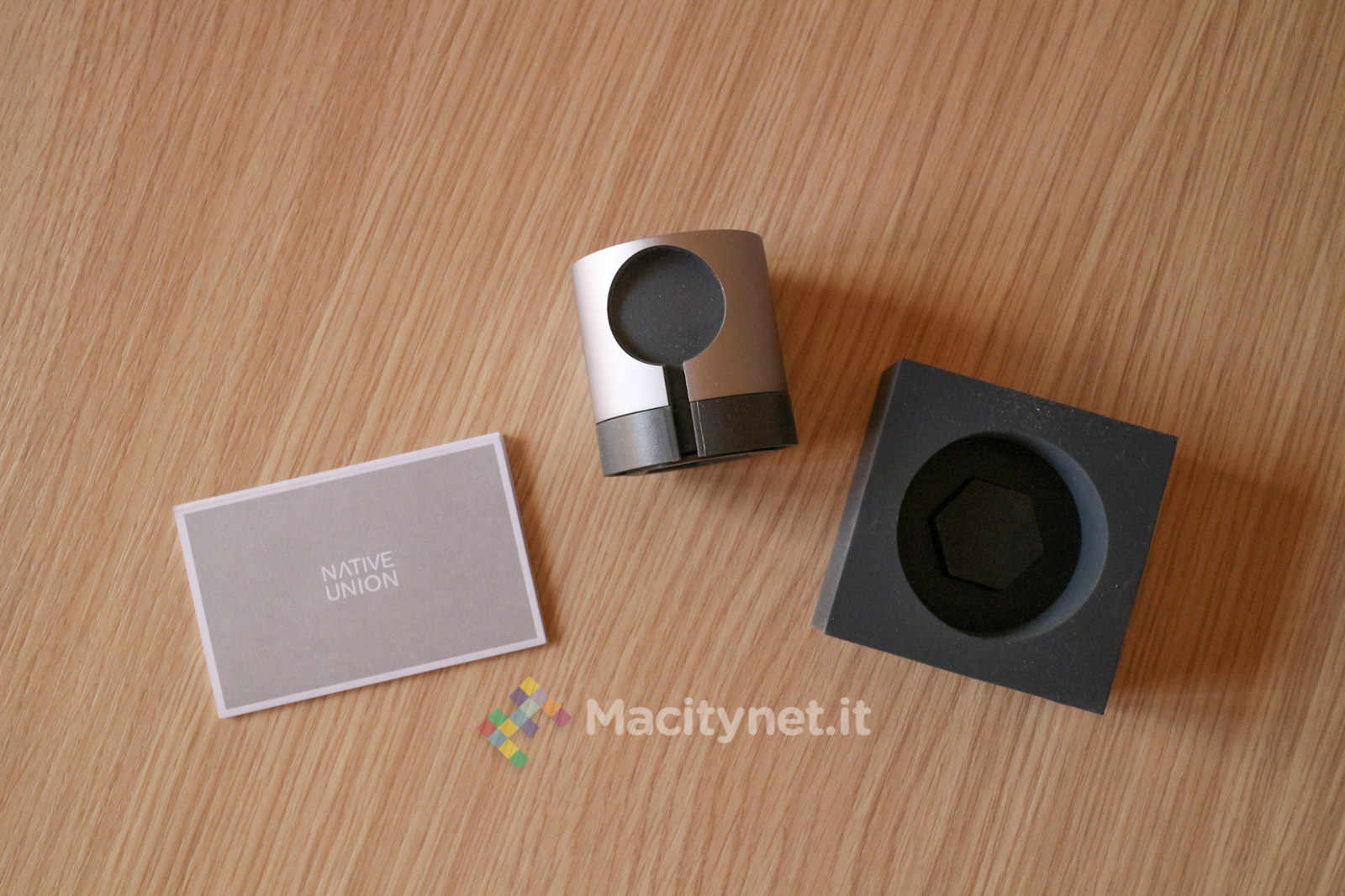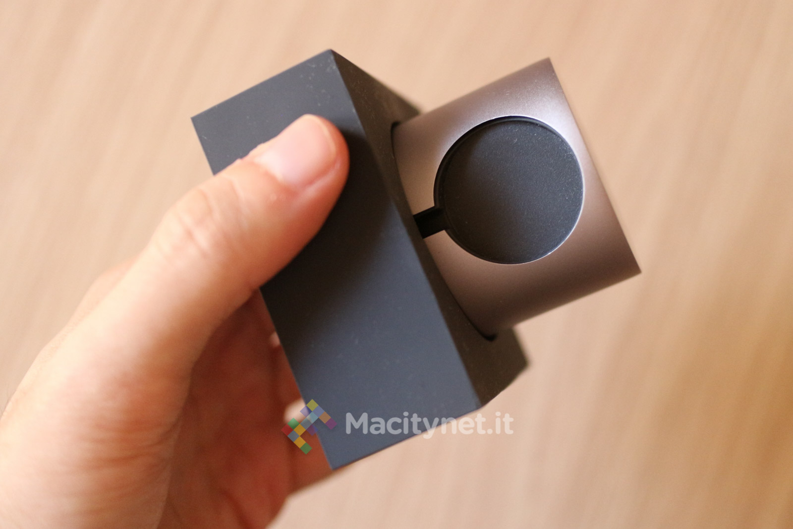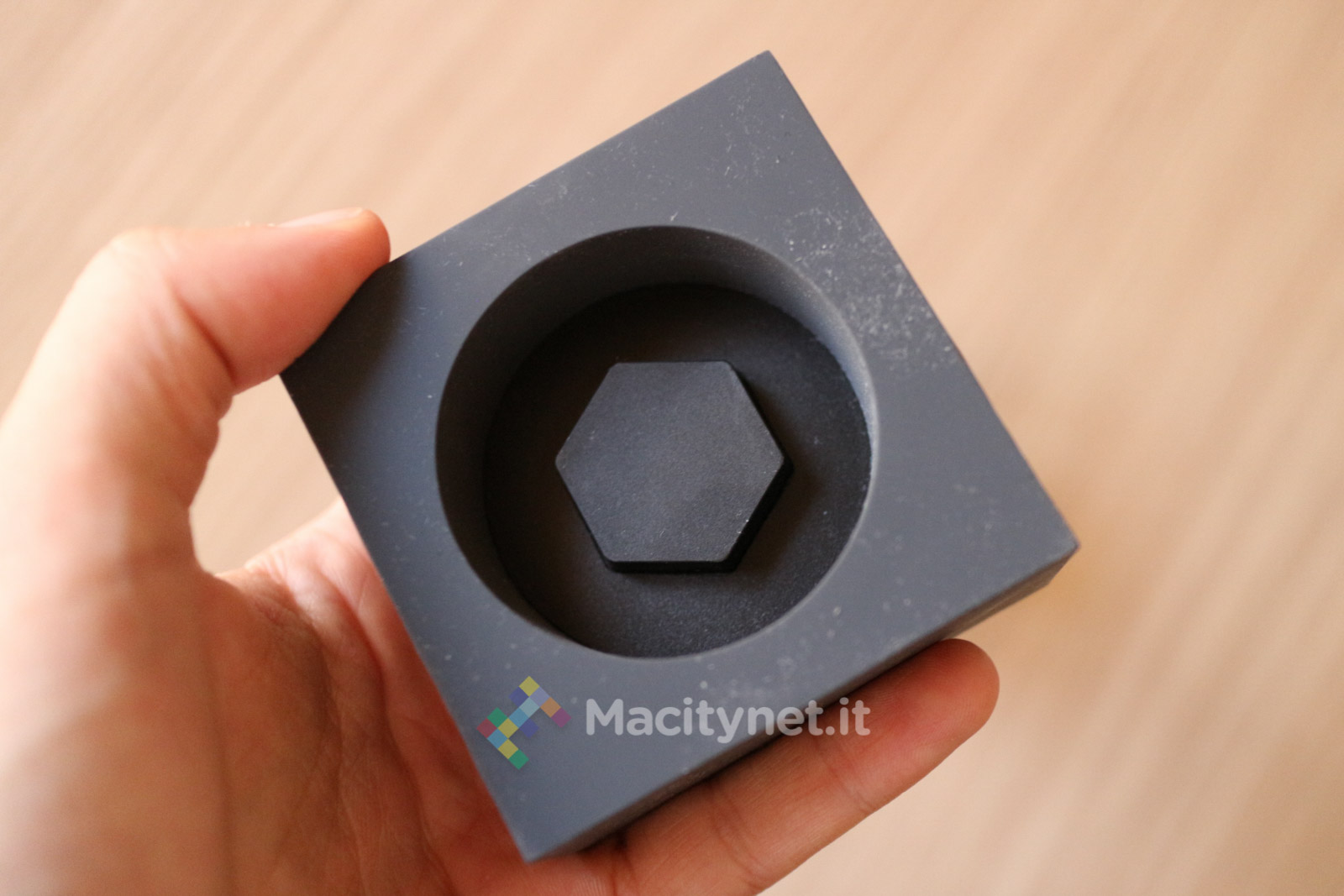 Il dock si presenta in due pezzi. Uno, dalla forma quadrata, molto pesante (400 grammi) e l’altra, un cilindro di metallo senz’altro più leggero (100 grammi) ma altrettanto solido, che si unisce alla prima. La forma esagonale del sistema ad incastro chiarisce come le due parti vanno montate tra loro, anche se finché si tengono le due parti separate, non è chiaro come queste restino fissate tra loro. Lo si scopre poco dopo, provando ad avvicinarle nel momento in cui, con uno scatto, le due parti vengono attratte magneticamente. La calamita che regola l’attrazione è davvero molto forte, bisogna tirare con forza se si desidera staccarle.