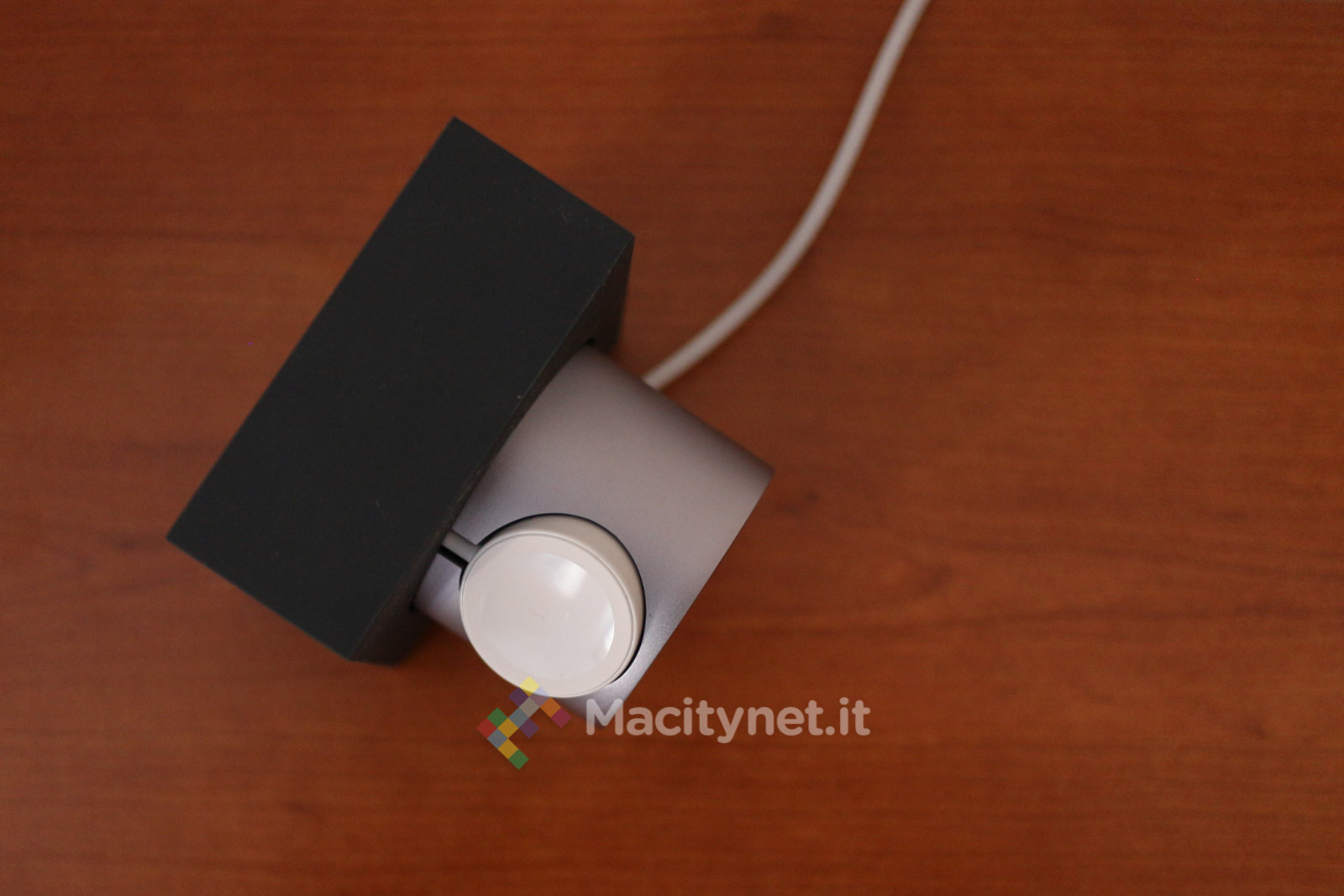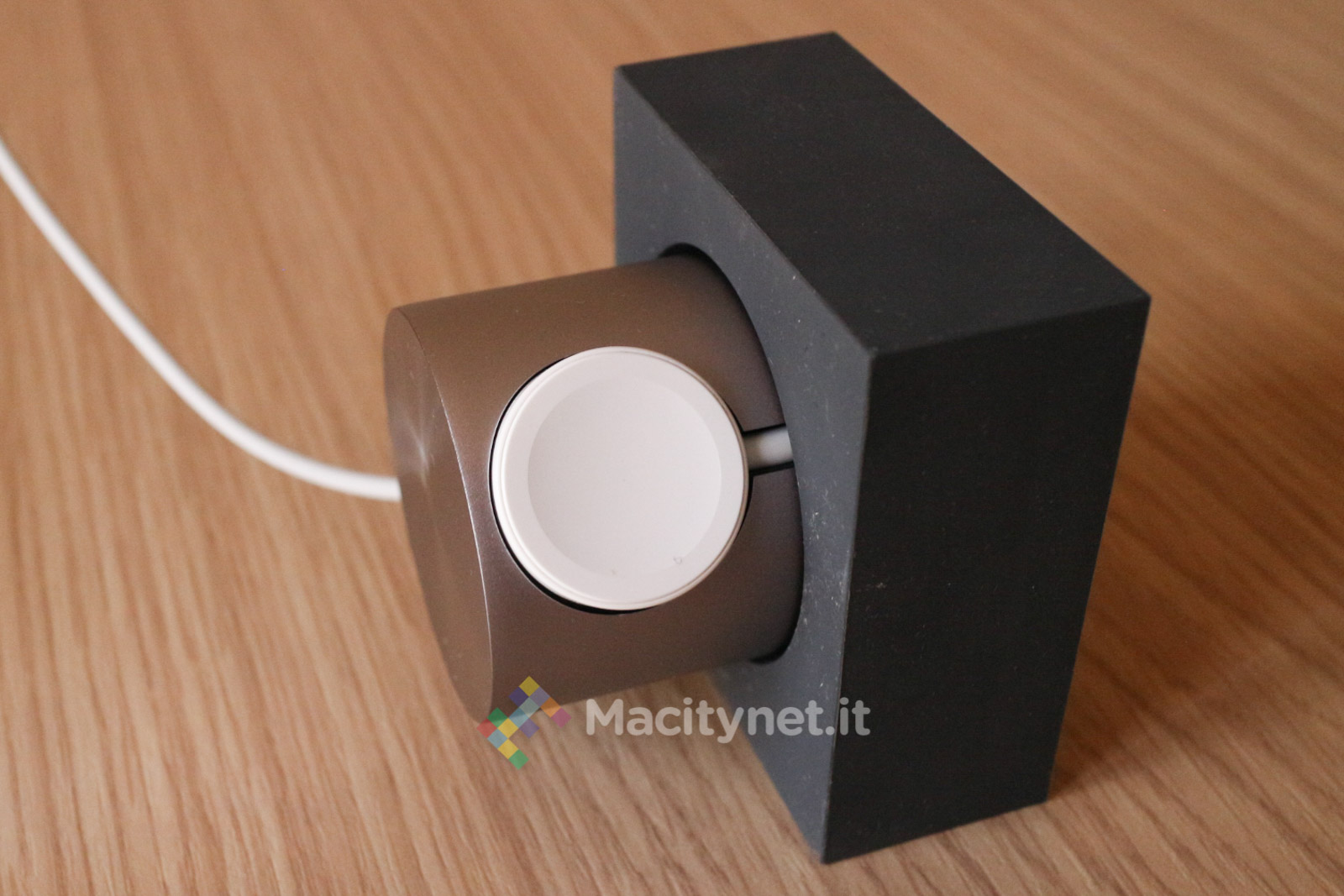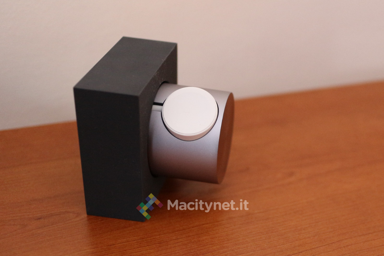Prima di agganciare il cavo di ricarica dell’Apple Watch abbiamo maneggiato il dock, apprezzandone il design ed i dettagli. Il cilindro in alluminio è satinato ai bordi, mentre la superficie esterna ha una diversa levigatura altrettanto piacevole al tatto. La parte inferiore, quella che si incastra alla base, è invece in plastica rigida di ottima qualità, così come è dello stesso materiale l’interno della base. Quest’ultima è principalmente composta da un pesante blocco di metallo rivestito con una morbida copertura in gomma. Si tratta di una scelta intelligente che evita di rovinare nel tempo il comodino, la scrivania o in generale la superficie dove si deciderà di appoggiare il DOCK. La copertura è abbastanza spessa: lo si scopre provando a fare forza sugli spigoli dove, con un po’ di insistenza, si riesce a fletterli leggermente. Questo lascia pensare che se, per sbaglio, il dock dovesse cadere, molto più difficilmente si romperà o danneggerà il pavimento su cui andrebbe ad impattare.