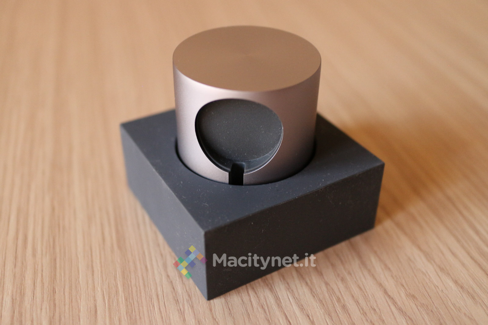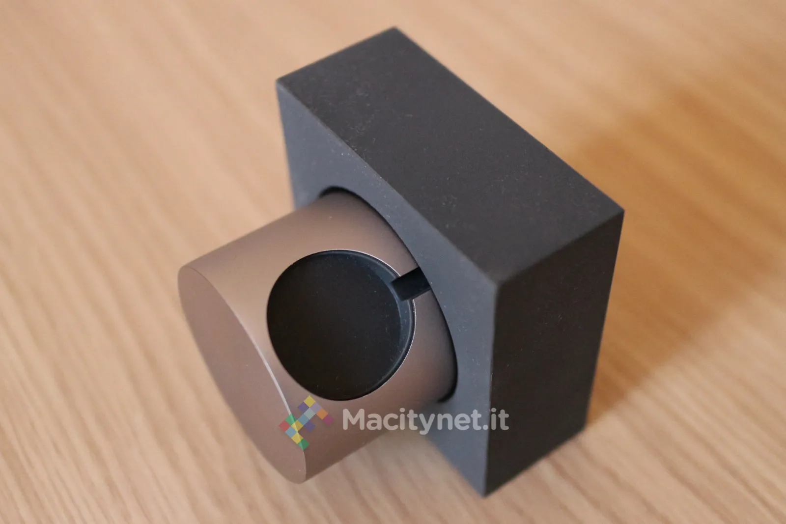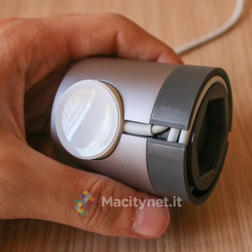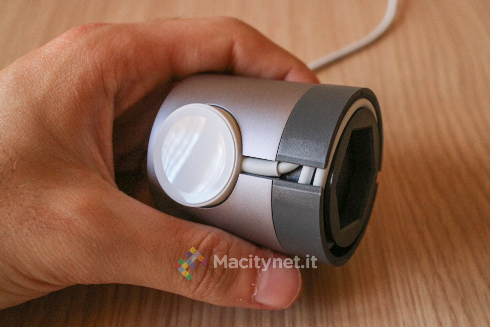 Prima di agganciare il cavo di ricarica dell’Apple Watch abbiamo maneggiato il dock, apprezzandone il design ed i dettagli. Il cilindro in alluminio è satinato ai bordi, mentre la superficie esterna ha una diversa levigatura altrettanto piacevole al tatto. La parte inferiore, quella che si incastra alla base, è invece in plastica rigida di ottima qualità, così come è dello stesso materiale l’interno della base. Quest’ultima è principalmente composta da un pesante blocco di metallo rivestito con una morbida copertura in gomma. Si tratta di una scelta intelligente che evita di rovinare nel tempo il comodino, la scrivania o in generale la superficie dove si deciderà di appoggiare il DOCK. La copertura è abbastanza spessa: lo si scopre provando a fare forza sugli spigoli dove, con un po’ di insistenza, si riesce a fletterli leggermente. Questo lascia pensare che se, per sbaglio, il dock dovesse cadere, molto più difficilmente si romperà o danneggerà il pavimento su cui andrebbe ad impattare.
