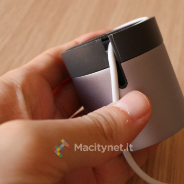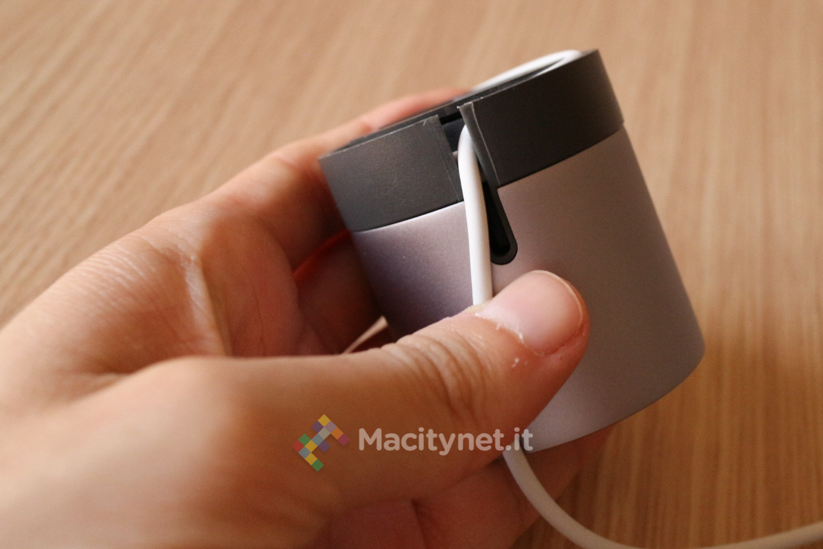 Incastrare il cavo di ricarica di Apple Watch è davvero molto semplice. E’ sufficiente infilare la piastra magnetica nell’apposita fessura, quindi far girare il cavo intorno alla scanalatura interna, per farlo uscire poi nel taglio che si trova dal lato opposto a quello della piastra. La scanalatura è abbastanza profonda da permettere di far fare più giri al cavo, accorciandone così la lunghezza finale. Con un po’ di insistenza se ne possono fare anche quattro, ma noi ci siamo limitati soltanto a due per evitare di flettere troppo le giunture del cavo. Non ci sono adesivi o sistemi magnetici che tengono ferma la piastra al DOCK. Semplicemente l’apposito alloggiamento, così come la gestione del cavo, fanno sì che, una volta incassata la piastra, non si muova più. Tuttavia sganciando le due parti resta comunque molto facile rimuovere il cavo, magari per agganciarlo ad un altro supporto o semplicemente riporlo in una borsa.