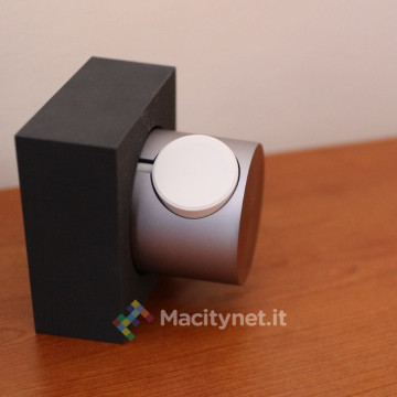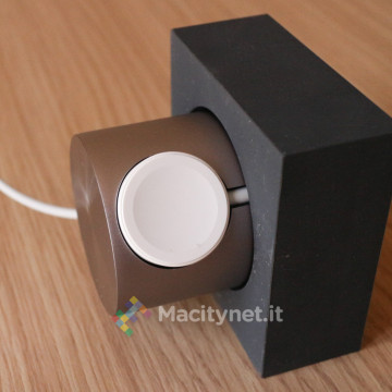 Se tutte queste caratteristiche dovrebbero far correre all’acquisto chi è interessato ad un prodotto del genere, la parte più interessante arriva adesso. Per forma e tipologia d’uso, il dock può essere utilizzato in due posizioni, verticale ed orizzontale, che rispettivamente permettono semplicemente di mettere in ricarica l’Apple Watch in maniera del tutto elegante, oppure di ricaricarlo sfruttando la nuova modalità Nightstand introdotta con watchOS 2. Questo è garantito dal sistema che permette di far ruotare il cilindro, con il cavo incassato, intorno alla base. In questo modo si potrà orientare tutto il supporto come meglio si crede, ricaricando l’orologio in verticale con il cilindro che spunta verso destra oppure verso sinistra, inclinandolo comunque come si preferisce, oppure appoggiando direttamente la base sul comodino ed orientando la piastra verso il proprio sguardo, trasformando così l’Apple Watch in ricarica in un comodo orologio-sveglia.