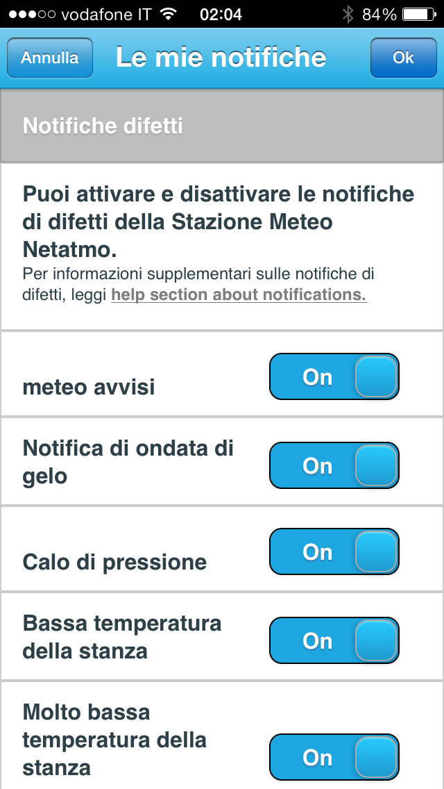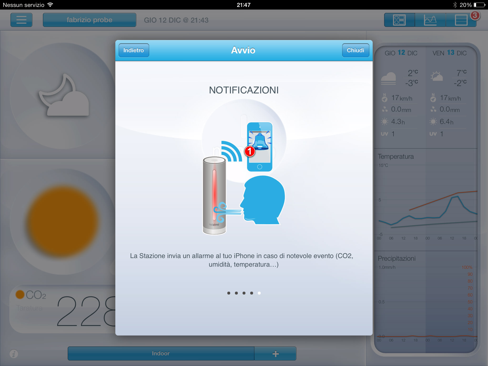 I due sensori, come detto, comunicano via Internet con il dispositivo su cui abbiamo installato l’applicazione di supporto. Questa app è in grado di ricevere notifiche su particolari eventi presentandole sull’app come badge, ma potremo vederle anche nel centro notifiche. Alcune notifiche sono già pre-programmate (come una improvvisa diminuzione della pressione atmosferica o un aumento dell’umidità del 20% in pochi minuti, temperature esterne sotto i 3 gradi o interne sotto i 10 gradi, Co2 sopra i 1000 ppm). L’app è però personalizzabile in vari aspetti, così che ad esempio possiamo essere avvertiti del raggiungimento di una certa temperatura o di un certo livello di umidità.
