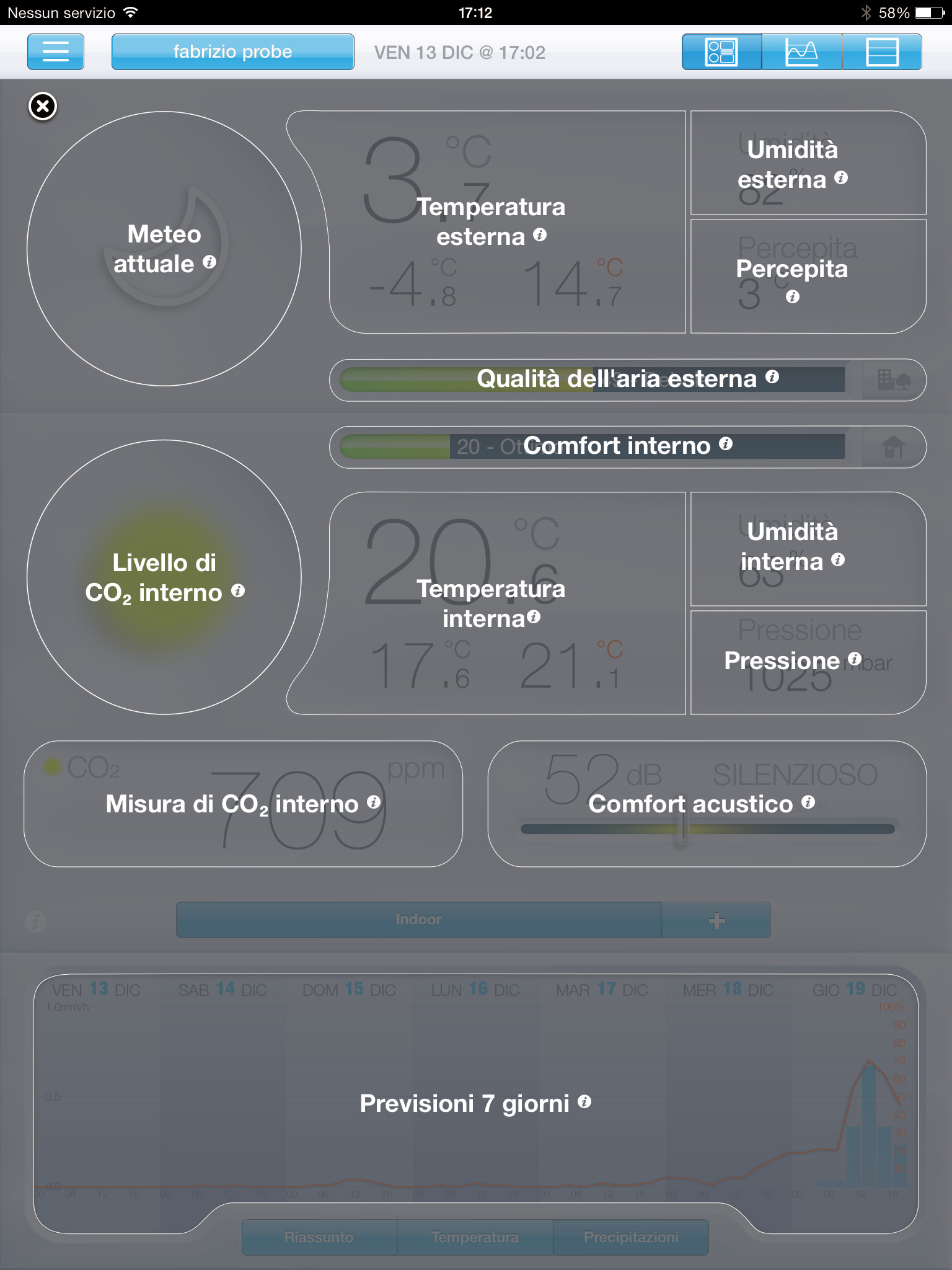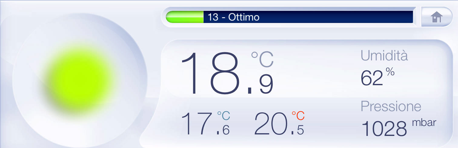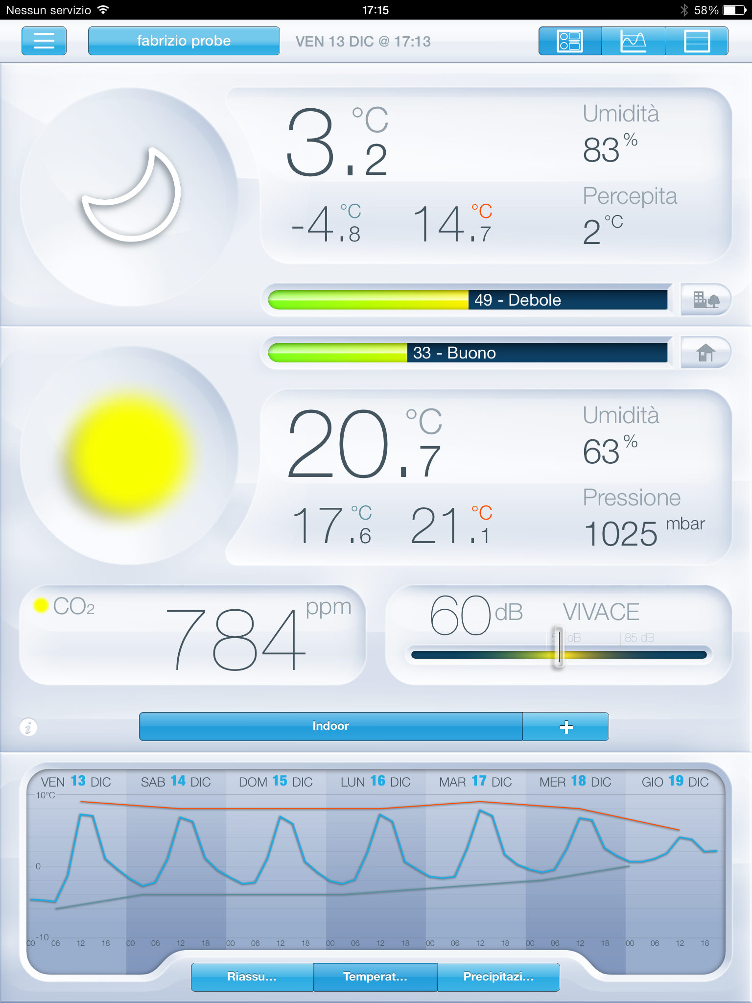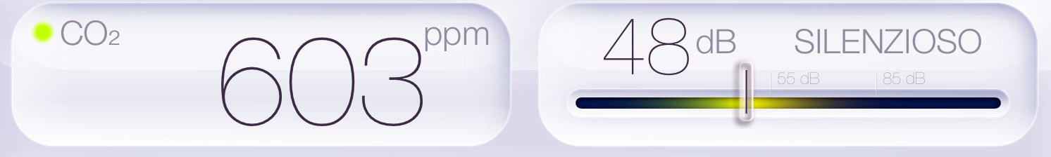 Di maggior interesse è il dato inerente l’inquinamento acustico. La stazione interna misura ogni cinque minuti il livello di pressione acustica in decibel in una stanza. Con la concentrazione di anidride carbonica, questo dato, accanto alla concentrazione di umidità e alla temperatura, contribuisce a dare una idea precisa di quanto confortevole un ambiente.