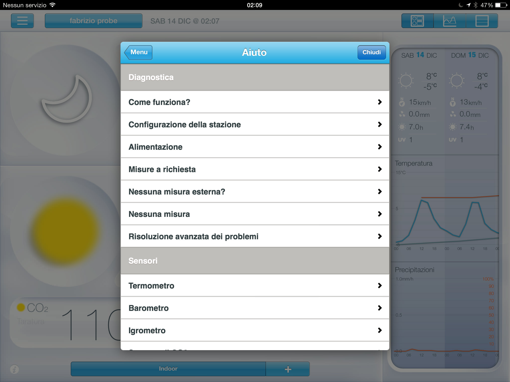 Il sistema fa tutto da solo, purchè sia attivo Bluetooth: prende nome della rete cui è connesso iPhone o iPad e si autoconfigura. Attenzione, però, la base è invisibile al Bluetooth che abbiamo nelle configurazioni; in pratica non vedremo da Impostazioni Generali il sensore interno e non potremo collegarci ad esso. È l’applicazione che fa parlare il Blutooth con il sensore.