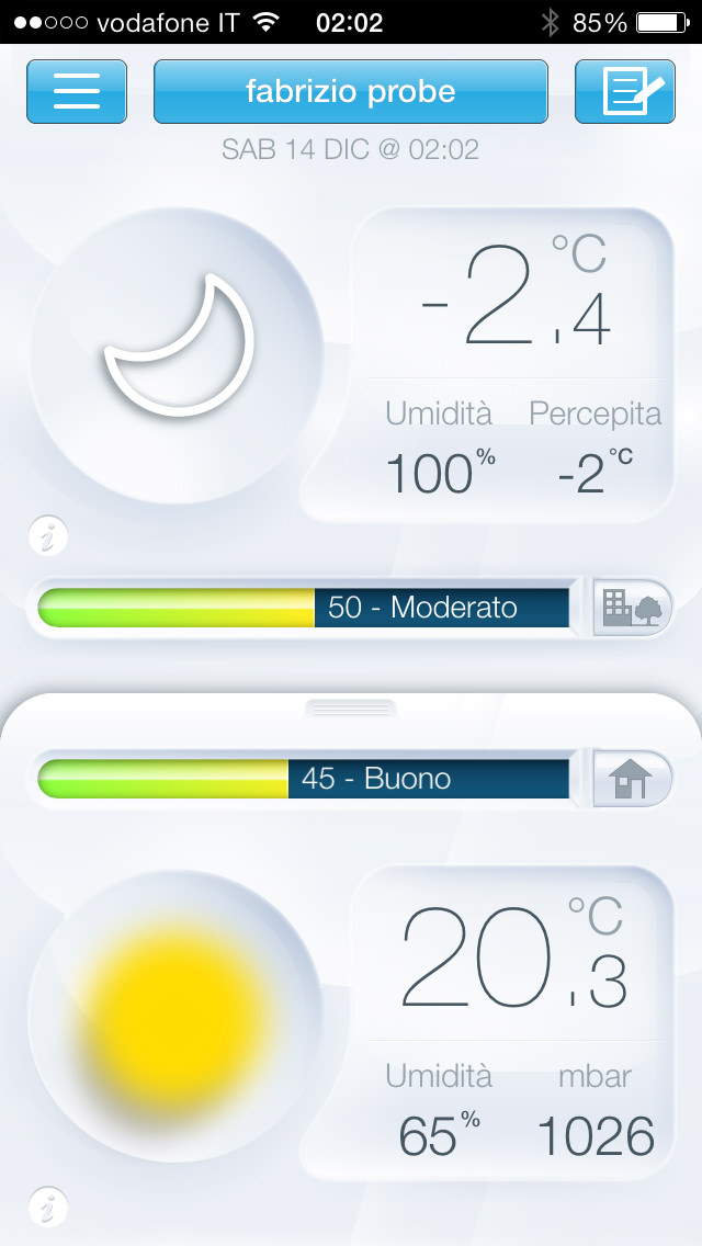 La chiave di tutto il sistema è l’applicazione iOS. È questo programma che riceve dai due sensori le informazioni e le elabora. Netatmo, questo va detto prima di ogni altra considerazione, ha creato un’applicazione di elevata qualità, ricca di informazioni e molto chiara nella lettura. Le due versioni per iPhone e per iPad forniscono gli stessi dati anche si comportano in maniera del tutto differente, adeguandosi alle dimensioni dello schermo.