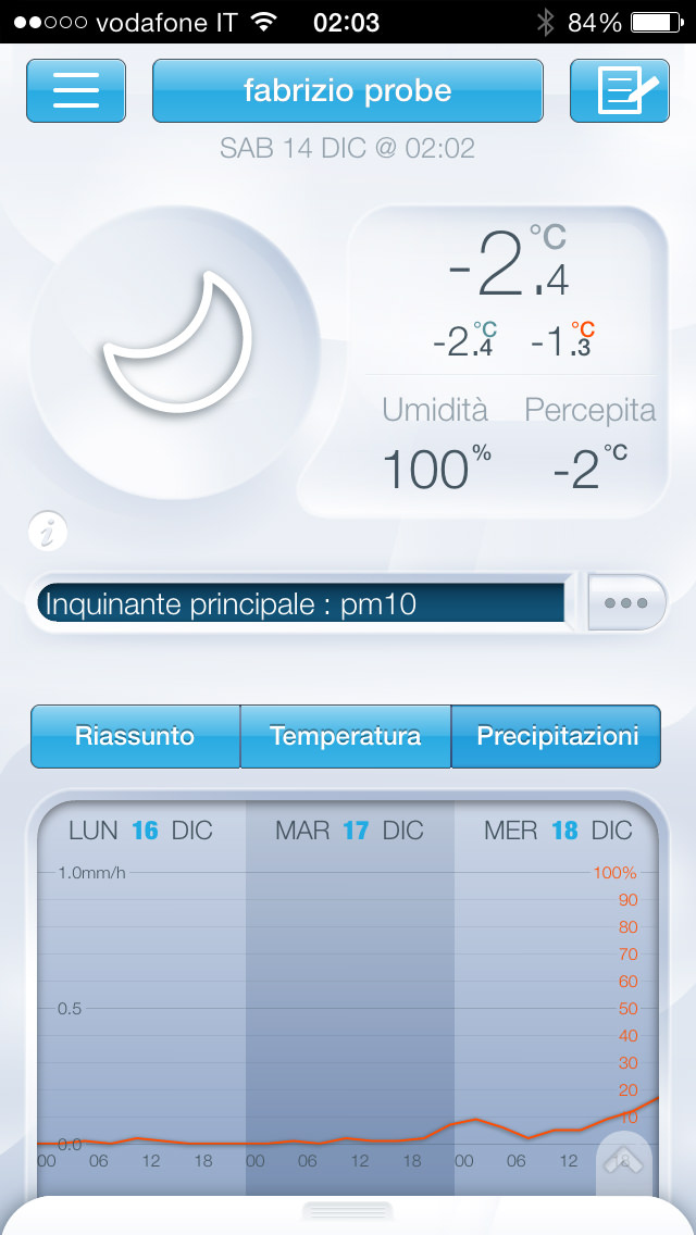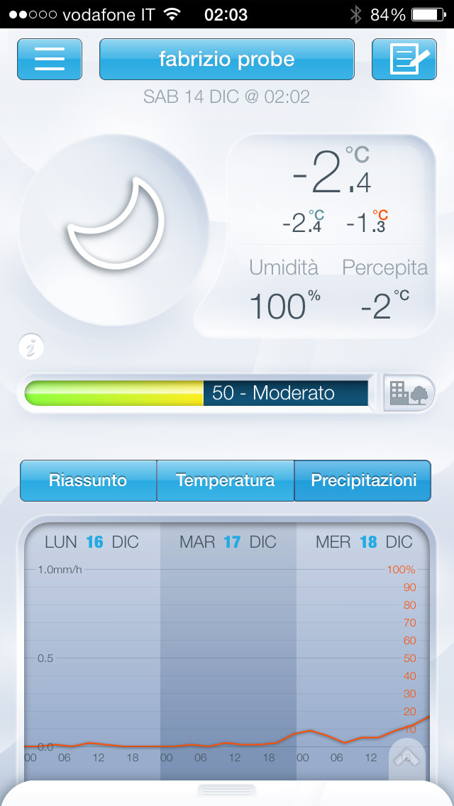 Una volta installato il sistema, come accennato, cominciano a fluire i dati sia dal sensore interno che da quello interno. Man mano che i dati si accumulano, l’applicazione costruisce un grafico lo storico della nostra stazione meteo. Avremo la possibilità anche di vedere le previsioni del tempo che arrivano da un server remoto. Pur non essendo frutto di una elaborazione in locale, ma della nostra posizione rilevata dal GPS, la presentazione grafica di questo dato è eccellente quanto quella dei dati locali, con informazioni grafiche come icone, e diagrammi che mostrano le previsioni su temperature e precipitazioni. Possiamo avere previsioni su una settimana; a fornirle è MeteoGroup, un’agenzia britannica per le previsioni del tempo. L
