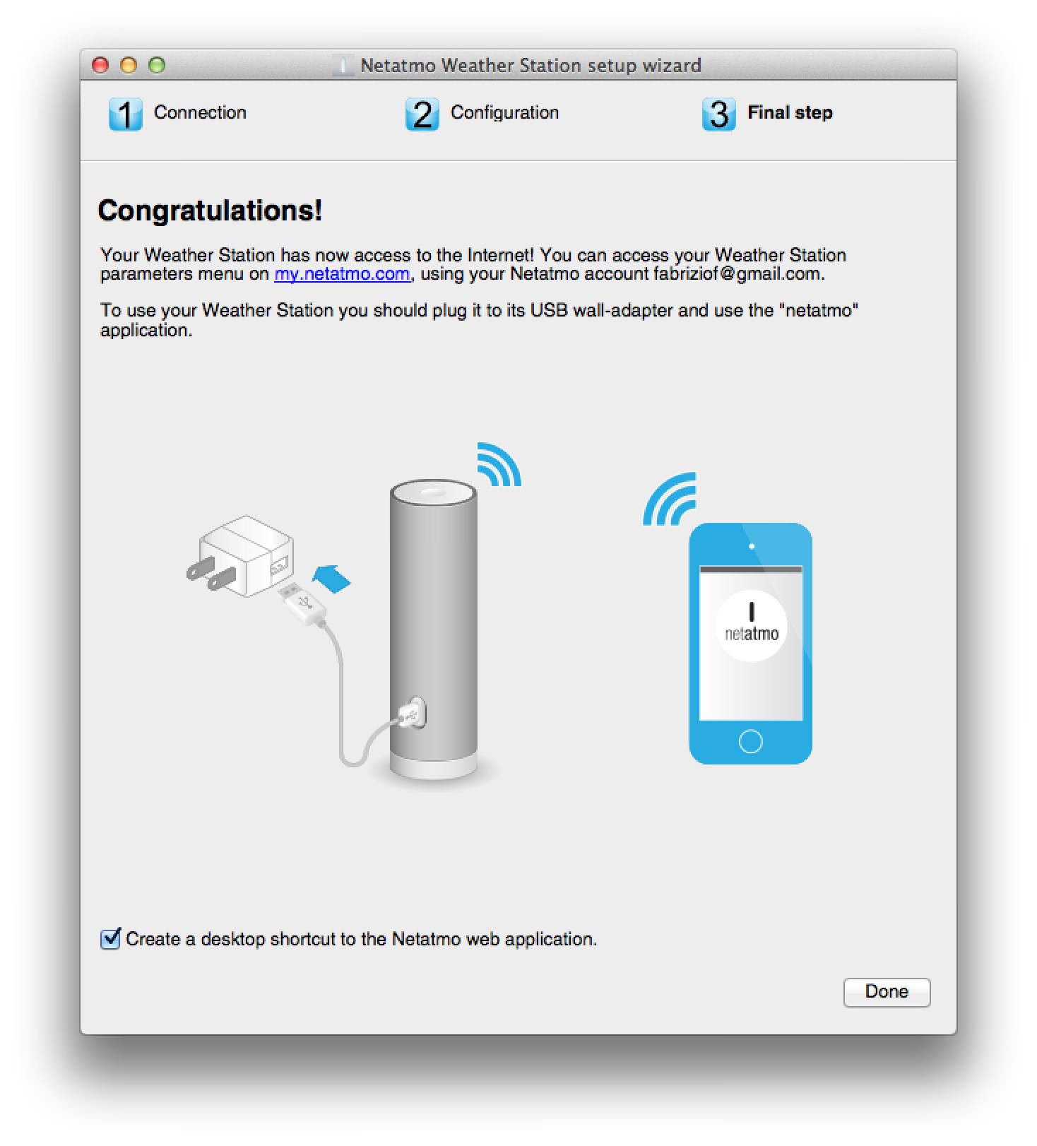 Abbiamo dovuto così procedere da soli, andando per alcuni minuti a tentoni per capire come far funzionare la configurazione. Una volta compresi i passaggi maneggiando l’app per iOS, scaricando quella per Mac dal sito Netatmo e frequentando il forum di Netatmo, siamo passati ad attivare la base. Abbiamo scelto di mettere in funzione il sistema usando il Mac ed è stato un processo velocissimo: abbiamo collegato il modulo interno, abbiamo lanciato l’applicazione ee a quel punto bastato inserire la password della nostra rete Wi-Fi. Poi abbiamo provato a configurare la base usando l’app iOS.
