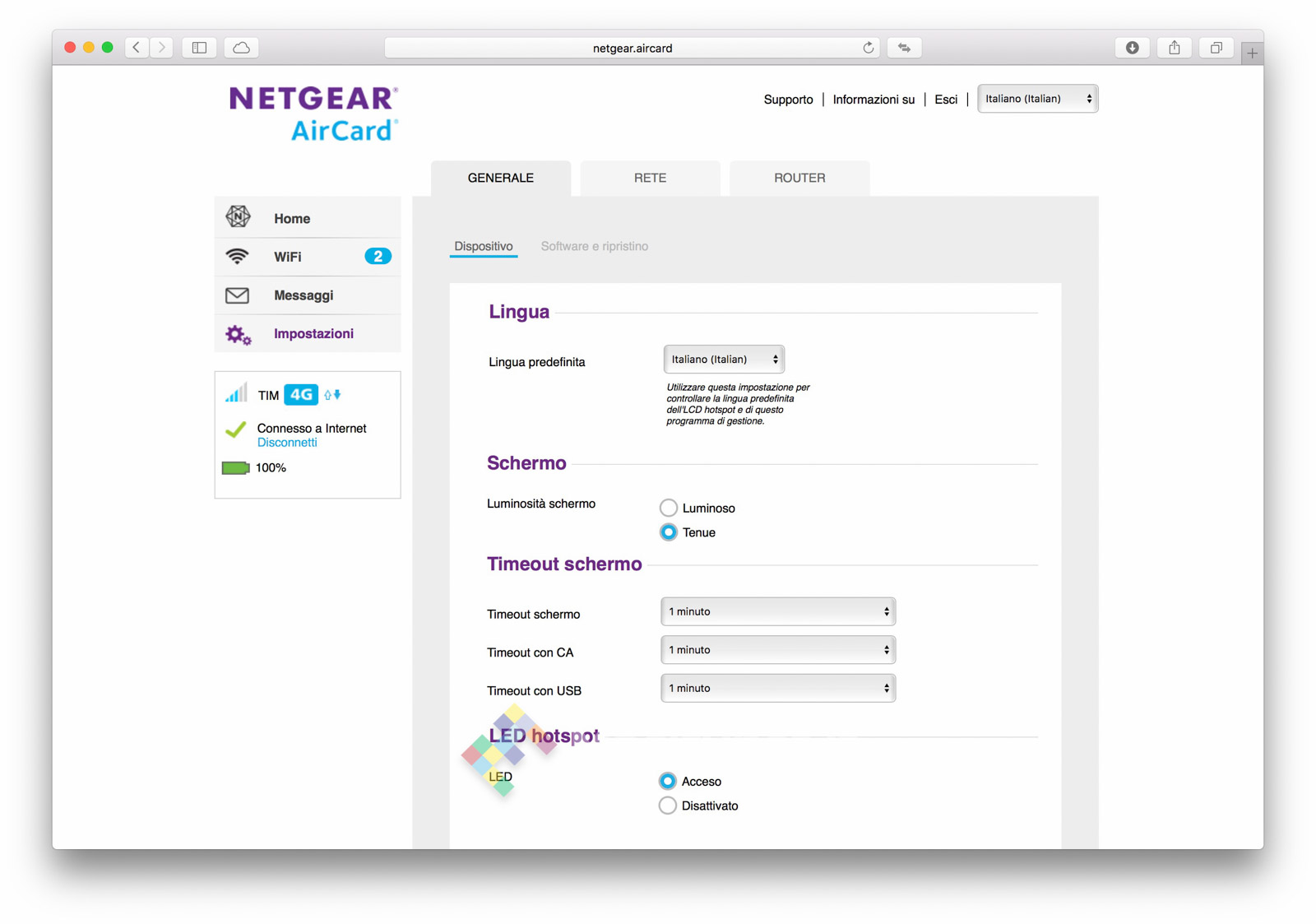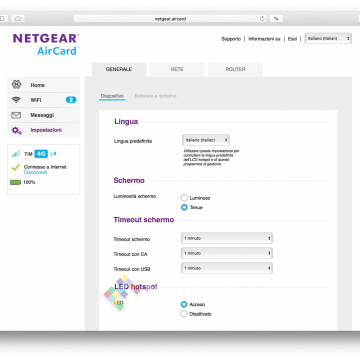 Dal pannello Impostazioni è possibile selezionare la lingua (c’è anche l’Italiano), decidere l’intensità luminosa dello schermo ed il timeout del display (durante il funzionamento a batteria, quando è collegato alla rete elettrica o quando è collegato tramite USB ad un computer), attivare o disattivare l’indicatore LED e decidere dopo quanti minuti/ore di inattività il router può automaticamente disattivare il WiFi per risparmiare la batteria.