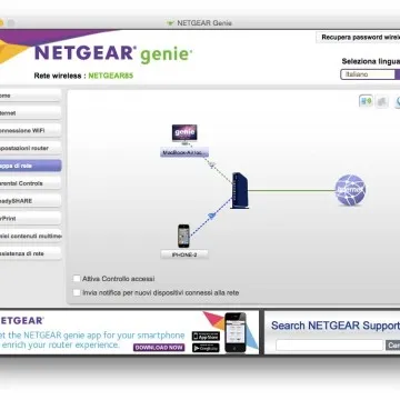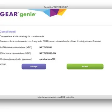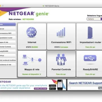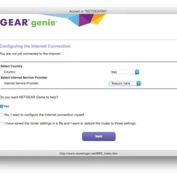 La prima operazione da compiere è inserire sul retro le tre antenne di serie nella confezione; è un’operazione molto semplice: basta collegare le antenne alle relative sedi filettate sul modem e allinearle avendo cura di orientare quella centrale verso l’esterno se possibile con un angolo di 45 gradi. A questo punto basta collegare il cavo telefonico del servizio DSL oppure il cavo di un altro modem via cavo o fibra, collegare l’alimentatore e accendere il modem. La configurazione iniziale può essere portata a termini in vari modi, noi l’abbiamo eseguita collegandoci con la rete Wifi di default creata all’accensione indicando la password di default stampata su un adesivo collocato sulla parte superiore del dispositivo (ovviamente si può modificare in seguito). Al primo avvio compare un wizard (procedura guidata) che aiuta nella configurazione: basta indicare la nazione dove ci troviamo, il provider, fare click su Next, attendere il rilevamento della connessione e applicare le impostazioni (i più esperti possono ovviamente annullare il wizard e indicare manualmente i vari parametri). A questo punto il router è pronto, preimpostato con SSID e chiave di rete (password) di default; se abbiamo seguito la procedura guidata, questa propone lo scaricamento dell’applicazione Genie per Mac o PC, una “dashboard” personale che consente di monitore, controllare e fare interventi vari sulla rete domestica. Confermando lo scaricamento si viene dirottati sul sito di Netgear, per avviare il download dell’applicazione (un file da 62.5MB nel caso della versione per OS X).