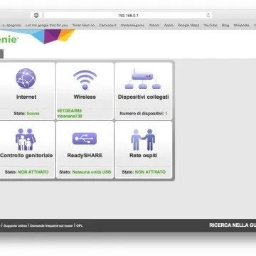 Similarmente a quanto avviene con altri modem/router è possibile sfruttare un qualunque browser per la prima configurazione e/o modificare le varie impostazioni. L’indirizzo di default è 192.168.0.1 (anche questo si può ovviamente cambiare): basta indicare “admin” come nome utente e “password” come password per entrare nell’area di amministrazione del dispositivo. Da questa sezione è possibile visualizzare o modificare le impostazioni del router. Le sezioni che è possibile richiamare sono, in effetti, due: “base” e “avanzate”; come è facile intuire, la prima permette di visualizzare e/o modificare parametri base, la seconda parametri avanzati, destinati a utenti più esperti. Dalla pagina home delle impostazioni è possibile visualizzare lo stato della connessione, il funzionamento della rete wireless, il numero di dispositivi collegati, verificare se è attivato o no il meccanismo di controllo genitoriale, se è attiva o no la funzione ReadyShare (vedremo dopo cos’è), se è attivata o no la rete Wi-Fi per gli ospiti.