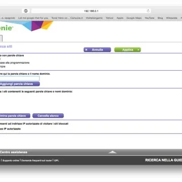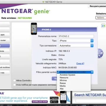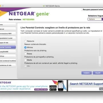 Una funzione di sicurezza denominata “Parental Control” permette di proteggere la famiglia limitando ad esempio l’accesso dei bambini alla rete con un filtro web per rendere sicura la navigazione. È possibile bloccare siti non appropriati e pericolosi, limitare l’accesso in determinate fasce orarie (ad esempio, impedendo l’utilizzo di Facebook nel momento dei compiti) o a determinate categorie di siti (per adulti, giochi, social media ecc.) e al tempo stesso proteggere i dispositivi della rete domestica da adware e phishing tramite un punto di controllo centralizzato. La configurazione si può fare avviando l’utility NetgearGenie, applicando impostazioni che consentono di specificare impostazioni di sicurezza per determinati utenti o in orari specifici. Per usare il Parental Control serve un account OpenDNS (si può creare gratuitamente), specificando il livello di protezione tra “nessuna” (nessun contenuto bloccato), “minima” (solo protezione da phishing), “bassa” (protezione da pornografia e phishing), “media” (protezione da siti con contenuti per adulti, attività illegali e phishing), “alta” (tutte quelle viste prime e siti di social network, condivisione video e “perditempo”). Dopo aver attivato la funzione Parent Control, l’utente può impostare il livello di filtro su ciascun dispositivo sulla rete dalla sezione “Mappa di rete”, portandosi nella pagina dei dettagli del dispositivo.