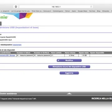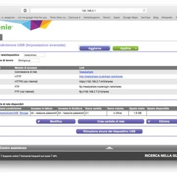 La funzione ReadyShare consente di accedere e condividere i dispositivi di storage USB (chiavette, hard disk e simili) collegati al router. Basta collegare il dispositivo a una porta USB 3.0 del modem (ne troviamo una sul lato destro e una sul lato sinistro); dopo un paio di minuti questo è pronto e gestibile alla stregua di un dispositivo di rete. Sul Mac basta selezionare dal Finder la voce “Vai”, scegliere “Connessione al server” e indicare nella casella indirizzo del server “smb://readyshare” (senza virgolette) scegliendo “Ospite” alla richiesta di nome e password. Il dispositivo verrà “montato” alla stregua di una qualunque altra connessione di rete e sarà possibile condividere documenti e file vari. Il meccanismo è comodo anche per eseguire backup (da Mac e PC) via rete su unità USB che non dispongono di questa connessione. Dalla sezione “ReadyShare” del pannello di amministrazione è possibile verificare la connessione USB, cambiare nome alla rete/dispositivo, indicare l’eventuale gruppo di lavoro, attivare o disattivare funzioni avanzate di condivisione (HTTP, FTP, HTTPS, ecc.) e rimuovere in modo sicuro il dispositivo.