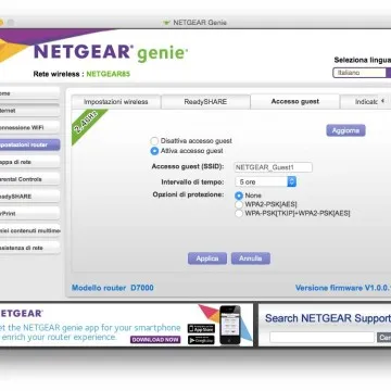 La funzione “Rete ospiti” permette di limitare gli accessi degli ospiti, creando un accesso separato per loro. Avviando l’applicazione Netgear Genie è possibile attivare o disattivare l’accesso “guest”, specificare l’SSID (il nome della rete) che vedranno gli ospiti, l’intervallo di tempo consentito (sempre, 1 ora, 5 ore, 10 ore, 1 giorno, 1 settimana), le eventuali opzioni di protezione e la chiave di rete. La connessione guest permette ad eventuali ospiti di sfruttare internet senza condividere con questi la nostra password, creando per loro una rete completamente separata. È possibile abilitare e configurare network WiFi per ogni banda (2.4 e 5 GHz) e consentire o no l’accesso al network (es. dispositivi WiFi o Ethernet).