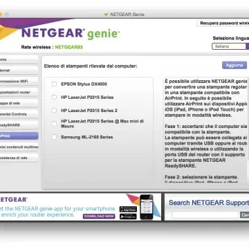 Alle porte USB del router è possibile collegare anche stampanti e quindi stampare da Mac e PC via rete in modalità wireless. Per il collegamento della stampante bisognerà installare eventualmente i driver del produttore di quest’ultima e scaricare l’utility “USB Control Center” dal sito di Netgear. A proposito di stampanti, molto interessante è la possibilità di convertire una tradizionale stampante in modello compatibile AirPrint e dunque utilizzabile da iPhone, iPad o iPod touch. Si può fare avviando l’applicazione Netgeargenie e selezionando la stampante rilevata e abilitando l’opzione Airprint. La stampante può essere collegata al computer tramite USB oppure al router in modalità wireless o utilizzando la porta USB del router stesso che integra, come abbiamo visto, la modalità ReadyShare.