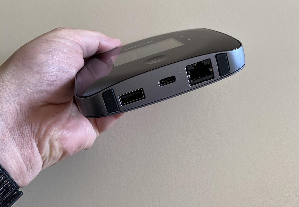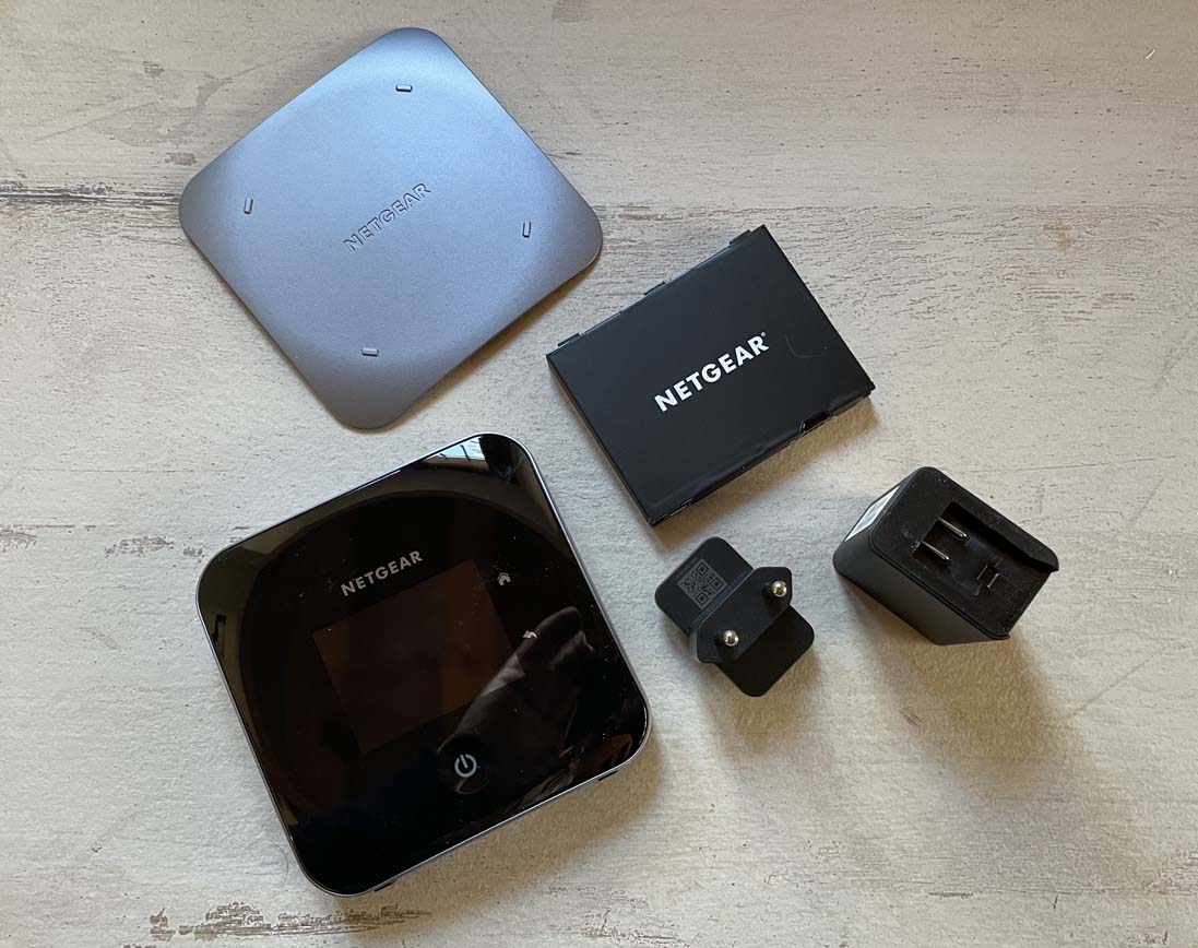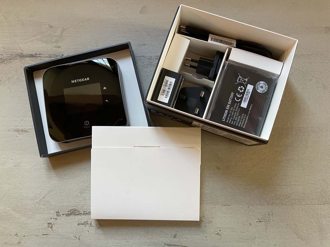Il router arriva in una piccola scatola all’interno della quale troviamo: il router vero e proprio (uno scatolotto (105,5 x 105,5 x 20,35  mm), la batteria agli ioni di litio  (3,85V 19.78 Wh), l’alimentatore, due adattatori per le prese di corrente (inclusa quella italiana) e un cavo da USB-C a USB-A, documentazione veloce. Sul router sono presenti i pulsanti di alimentazione, Home e Indietro per la gestione dell’interfaccia dal dispositivo. Sulla parte posteriore troviamo le due porte delle antenne (a destra e sinistra), una porta USB tipo A, una porta USB tipo C e la porta ethernet (LAN o WAN) alla quale è possibile collegare ad esempio una stampante da mettere in rete.