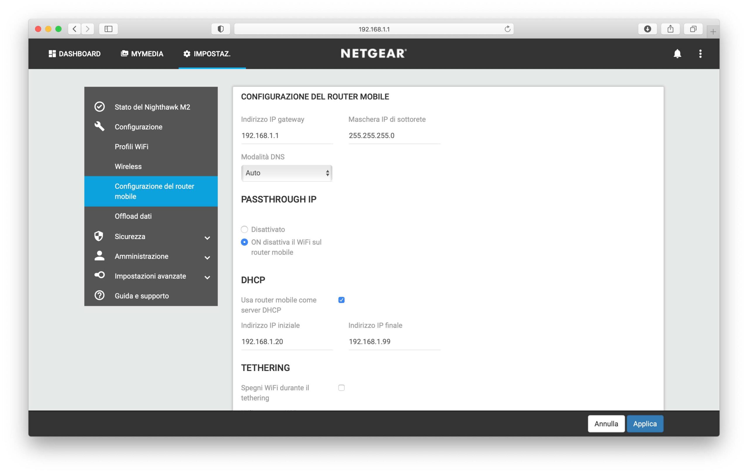 Per configurare il router basta tenere premuto il pulsante di alimentazione per tre secondi. Al primo avvio viene visualizzata una schermata di configurazione che basterà seguire per modificare SSID, password di rete e password dell’utente amministratore. La configurazione può avvenire anche da browser (da Mac, PC, iPad, iPhone, ecc) collegandosi alla rete WiFi creata dal router e aprendo l’indirizzo di default 192.168.1.1. La password di default si trova sull’etichetta posta sotto la batteria (è ovviamente possibile e consigliabile cambiarla).