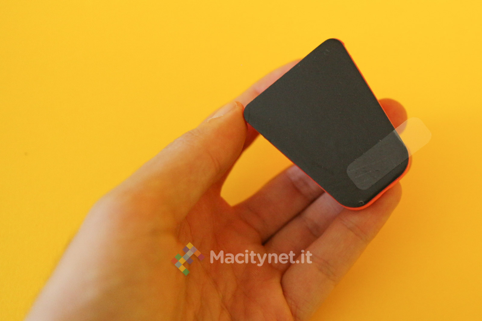 Non ha infatti la classica forma a coppa, piuttosto appare come un sottile strato gommato nero ed al tatto molto appiccicoso, seppur in realtà non sembra esserci alcuna soluzione collante che col tempo potrebbe perdere le proprietà che in realtà garantisce. La pellicola “adesiva”, termine che dobbiamo necessariamente mettere tra virgolette, in realtà appartiene a quella classe di materiali che abbiamo visto in diversi supporti smartphone per auto, capaci di trattenere magicamente e con grande decisioni pesi ben superiori a quelli di Apple Watch.