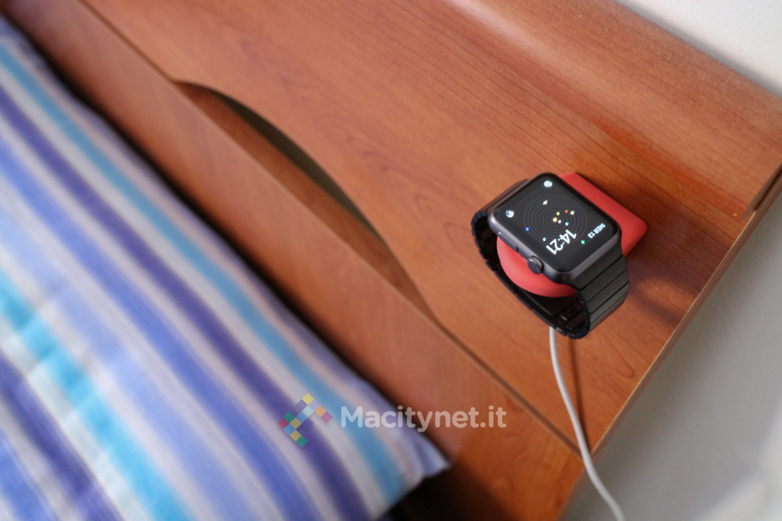 Per il nostro modo di utilizzare Apple Watch, ovvero come orologio notturno in sostituzione di una radiosveglia da comodino, abbiamo preferito la classica sistemazione orizzontale sul comodino che ne abilita la modalità NightStand, per la quale prende per appunto nome il supporto. Anche in questo caso la ventosa fa sì che l’orologio non si sposti neanche di un millimetro: ciò significa che se durante la notte, nel cercare Apple Watch a tastoni, lo si urta per errore (ci è capitato), certamente non cadrà a terra, evitando così spiacevoli conseguenze.