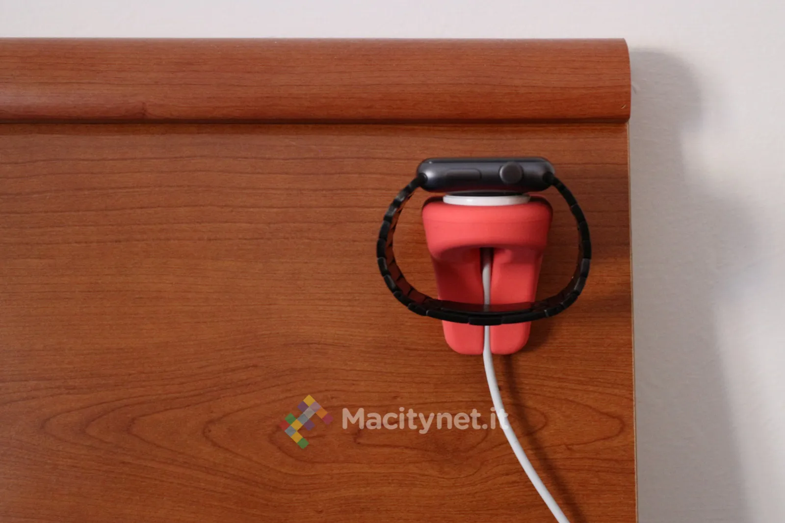 Abbiamo quindi provato a spostarlo sulla spalliera del letto, ricaricandoci Apple Watch per circa una settimana ed avendo al contempo la certezza che, anche se fosse caduto durante la notte, sarebbe poi atterrato sul morbido. Anche qui, il supporto non si è mai staccato, a conferma del fatto che il sistema a ventosa è del tutto affidabile.