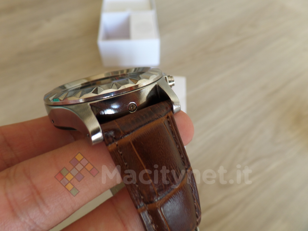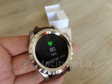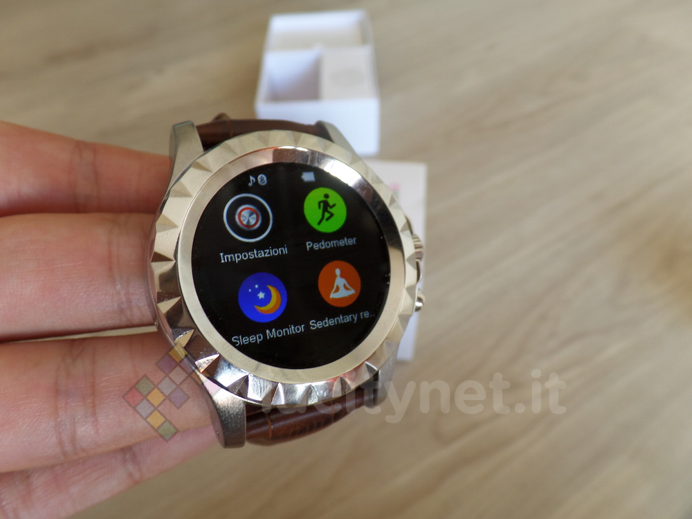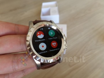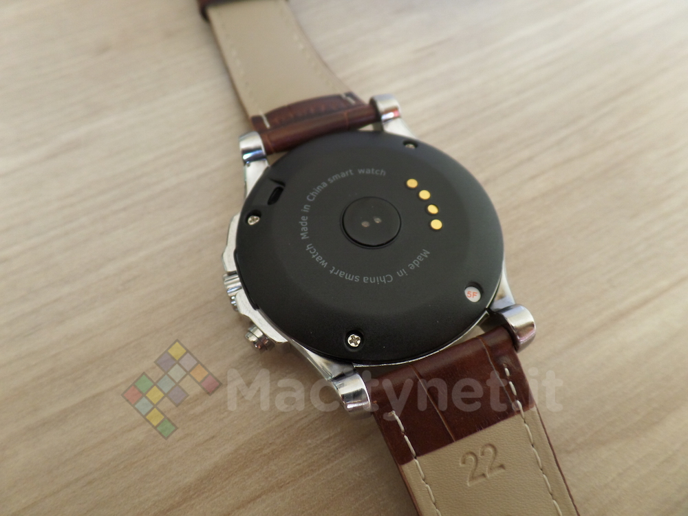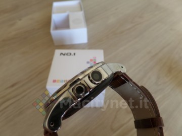 Il cinturino è un classic 22mm e può essere facilmente sostituito. Su Gearbest l’orologio viene fornito con vari cinturini, in metallo o in pelle. Il nostro campione ne aveva uno in pelle che, seppure (secondo quanto si legge stampigliato su di esso) sarebbe naturale, non brilla per qualità. In ogni caso, volendo fare un paragone con Zeblaze Rover, il cinturino di questo No.1 Sun S2 è nettamente migliore e si indossa senza fastidio durante l’arco di tutta la giornata.