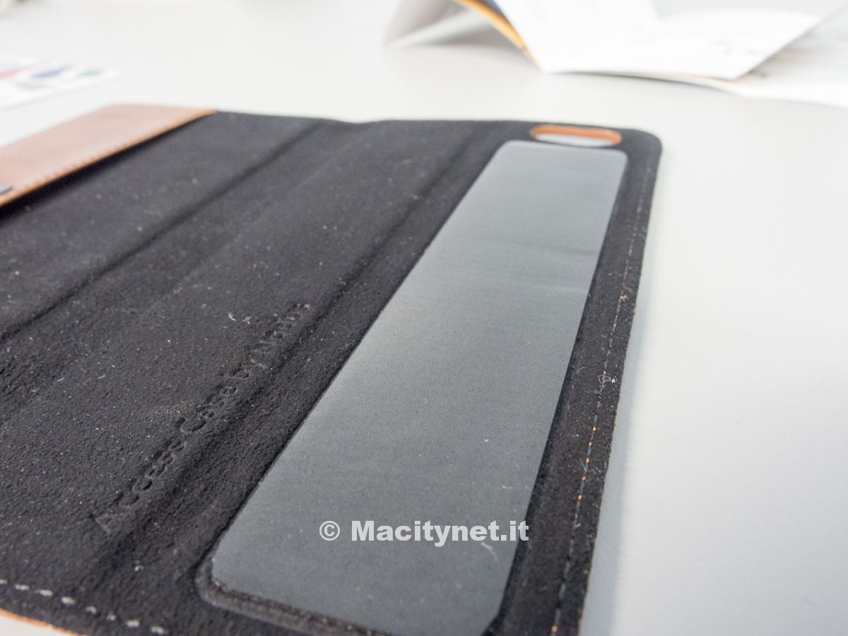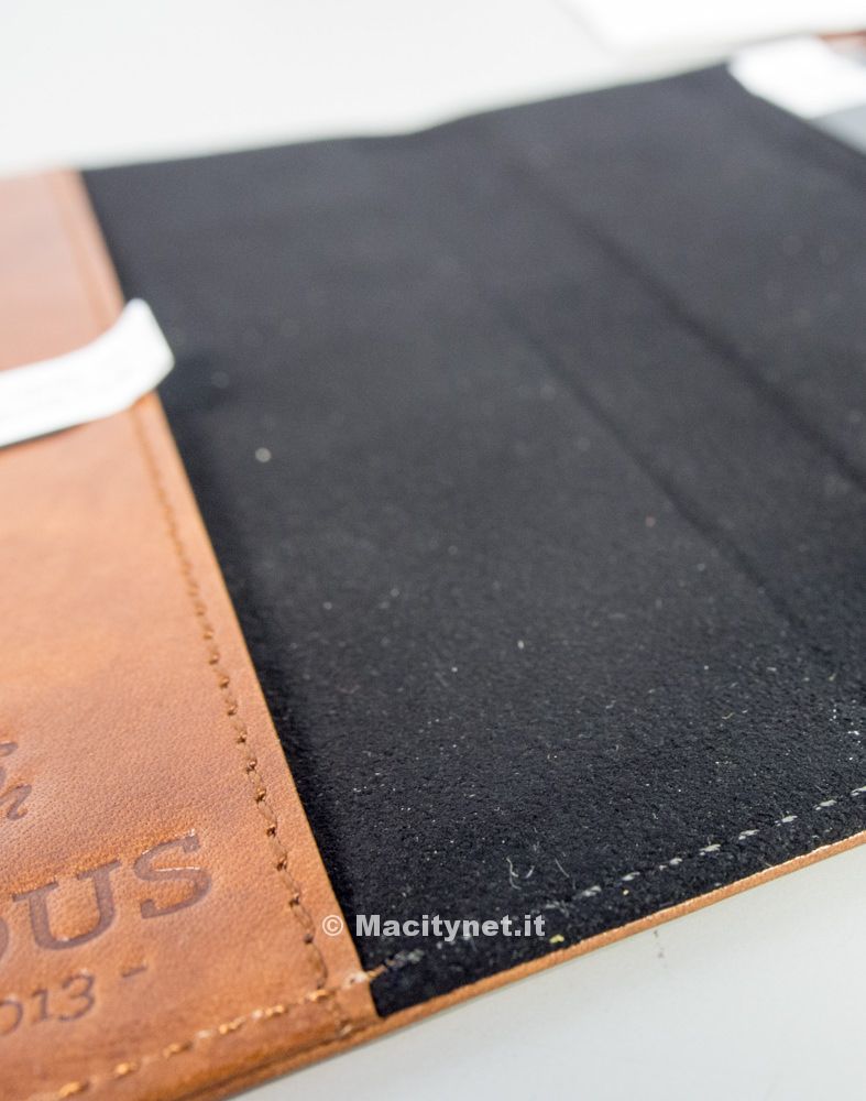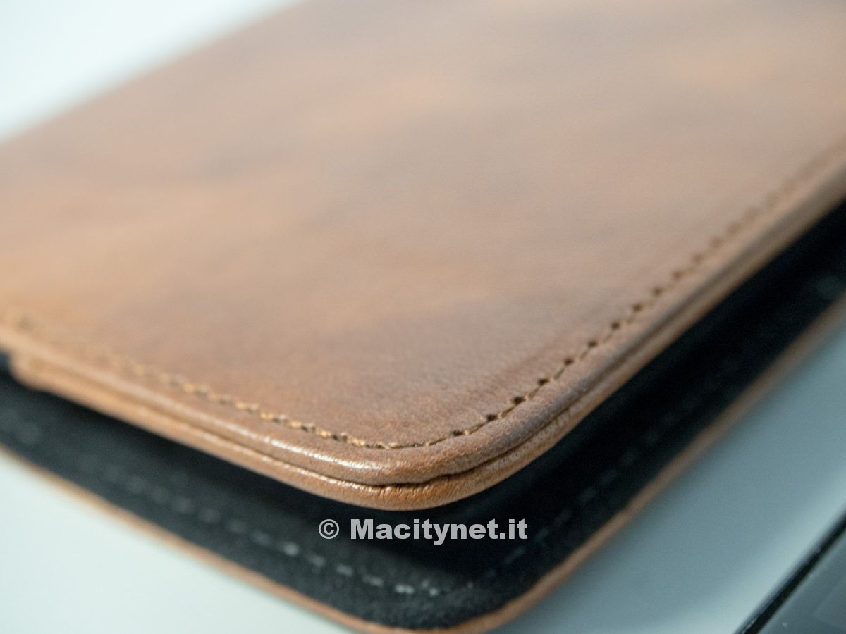 Il primo aspetto che balza all’occhio, ma sarebbe meglio dire ai tre sensi: vista, olfatto e tatto, è la differenza dal “plasticume” che costella negozi e negozietti on line e fisici che si trova in giro. Si tratta infatti di una custodia in pelle italiana di ottima qualità, morbida al tatto, che promana un profumo caratteristico della vera pelle e che di presenta rifinita con cura ammirevole del dettaglio su materiali naturali e con tintura che evidenzia la trama naturale della pelle, piacevolemente imperfetta  nel colore come solo un materiale naturale può e deve essere.