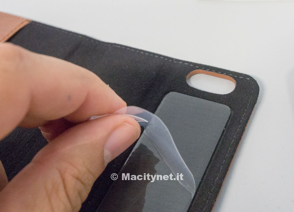 Notevole il sistema con cui  la custodia si fissa al dispositivo. Piuttosto che inserire l’iPhone in una classica custodia ad incastro, la Nodus sfrutta un sistema a microaspirazione per trattenere il telefono. Sostanzialmente è una striscia che aderisce al dorso attaccandosi al dispositivo ma senza colla, quindi non lascia alcun residuo nel momento in cui si decide di togliere il telefono: un’operazione che comunque può essere effettuata soltanto esercitando una certa forza. Anche l’aletta interna ha una piccola porzione di questo particolare materiale che si fissa al display – anche se qualche volta tende ad aprirsi – mantenendo chiusa la copertina quando non utilizziamo il dispositivo.