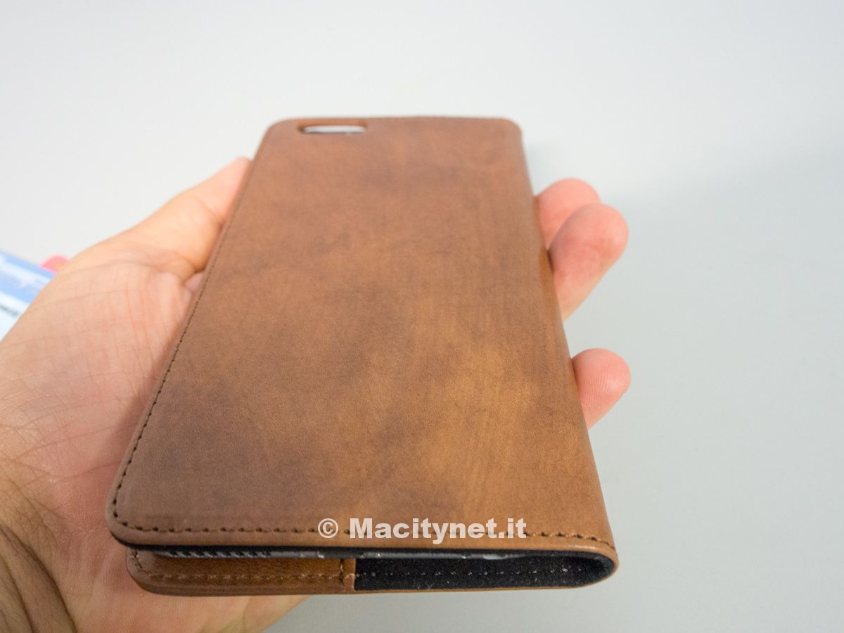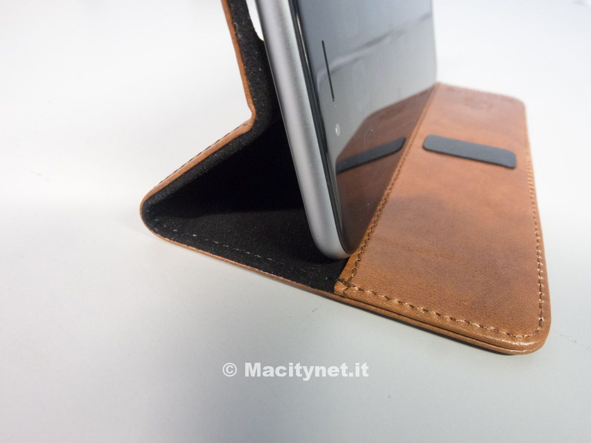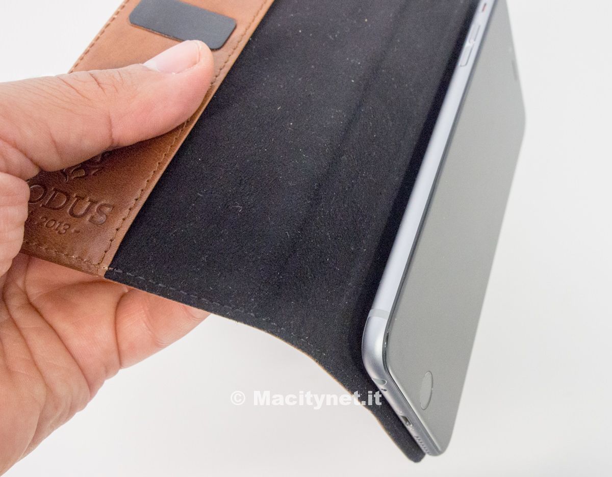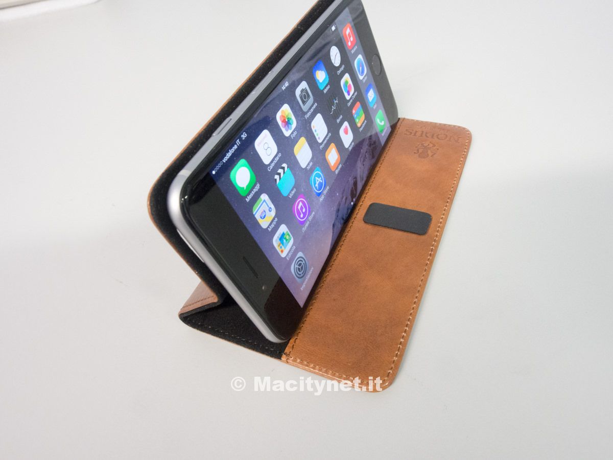 Sebbene sia abbastanza rigida, la custodia può essere all’occorrenza piegata diventando un piccolo leggio: non è particolarmente orientabile, di fatto può assumere una sola posizione, che comunque si rivela ottima per vedere filmati o navigare senza dover tenere l’iPhone in mano. Molto utile specialmente sul più grande iPhone 6 Plus, visto l’uso che si può fare di esso grazie anche alla modalità Landscape studiata da Apple per il nuovo telefono.