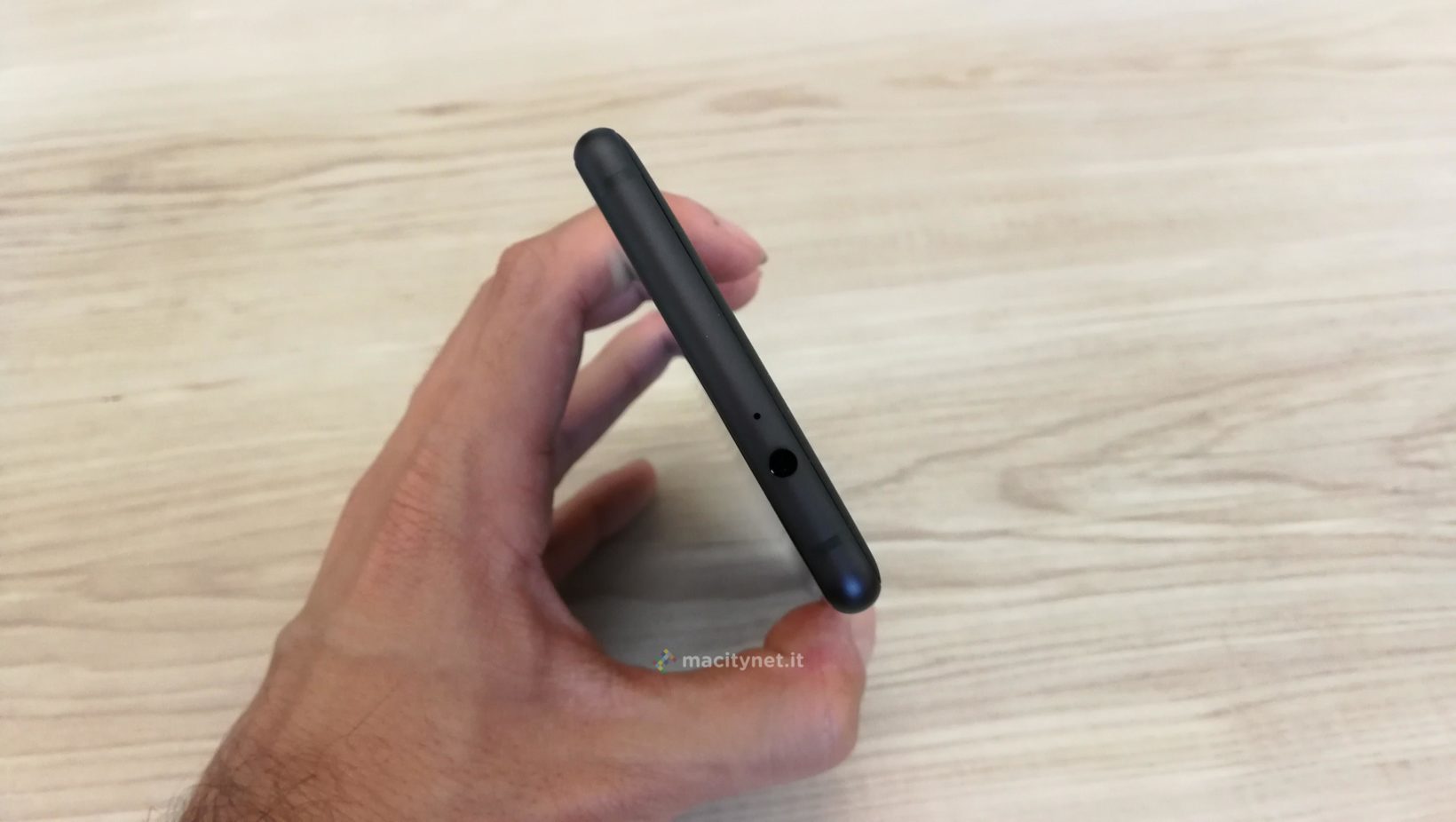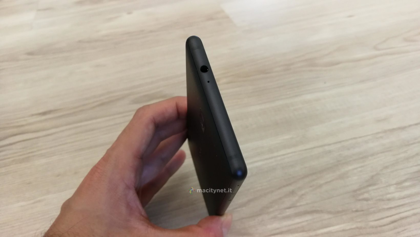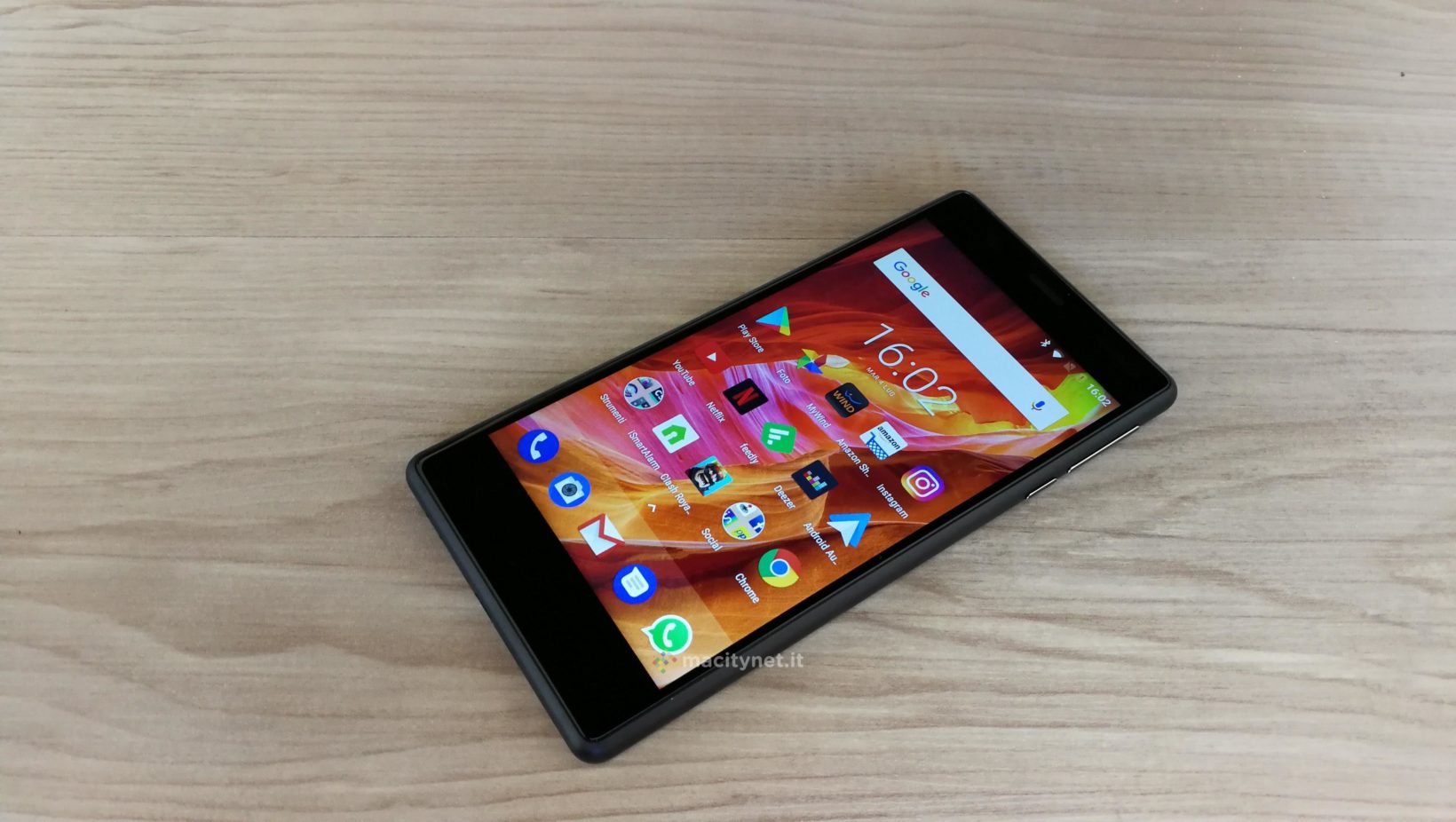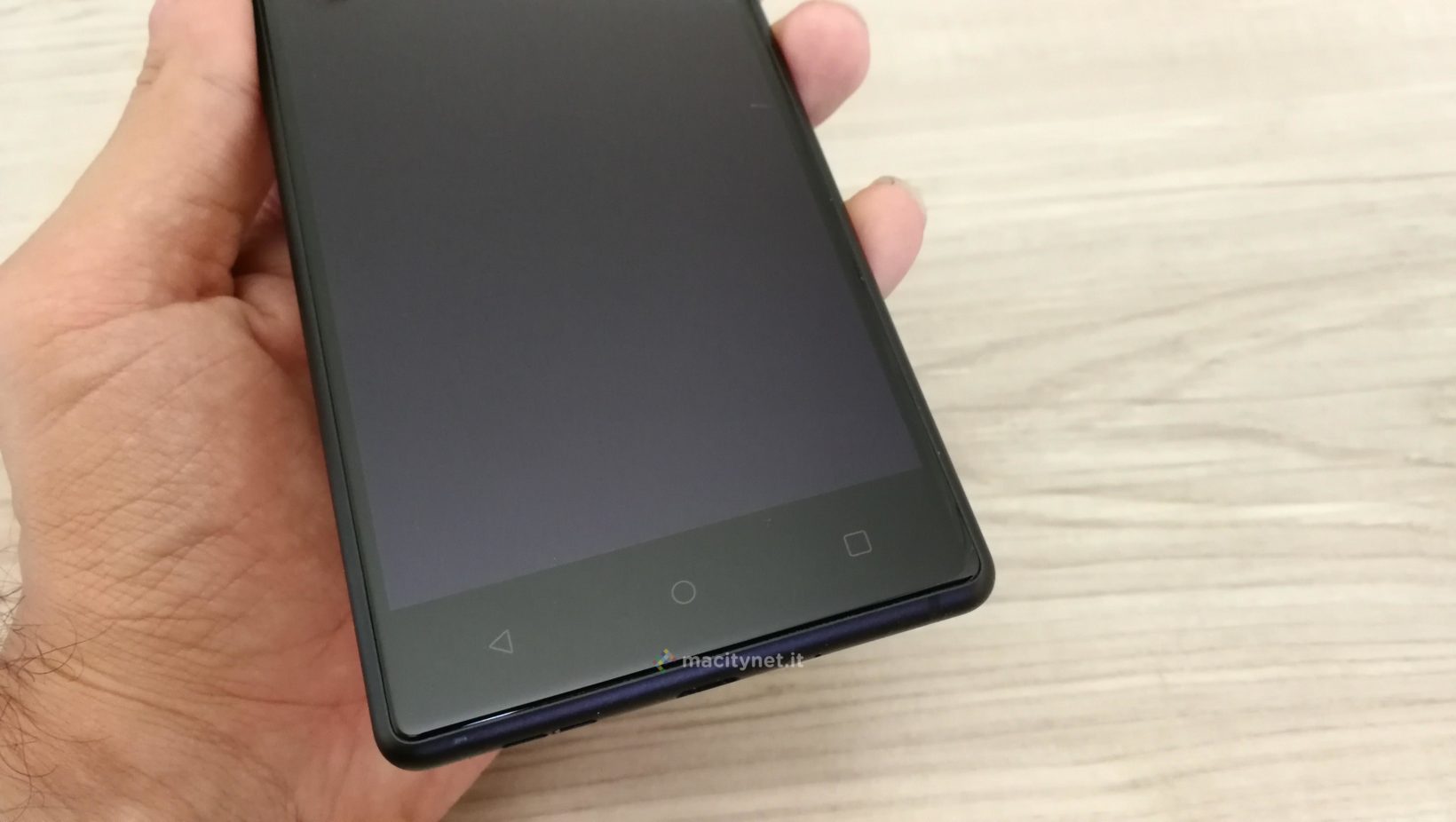 Sarà l’effetto condizionamento, dato dal nome importante, eppure prendendo in mano il terminale per la prima volta si ha una bella sensazione. Il telefono è estremamente leggero, con dimensioni contenute in 143.4 x 71.4 x 8.5 mm , ben costruito e, seppur privo di materiali pregiati, restituisce una sensazione di solidità e si percepisce come un terminale ben assemblato. Un fatto senza dubbio importante per un dispositivo che costa poco più di 150 euro. Con una parte posteriore completamente in plastica, l’estetica del dispositivo richiama quella di un Nokia Lumia 800. Risulta esteticamente elegante e minimale, con una parte frontale ben ottimizzata: lo schermo da 5 pollici, con risoluzione HD, viene circondato da cornici sottile ai lati, un po’ più pronunciate sulla parte superiore e inferiore, dove svettano tre pulsanti a sfioramento, purtroppo non retroilluminati, Manca il sensore per le impronte digitali, che risulta ormai onnipresente in molti smartphone di fascia bassa. In effetti se ne sente la mancanza, ma è inutile negarlo: in un telefono da 150 euro sarebbe stato difficile implementarne uno davvero efficiente, ed allora risulta condivisibile la decisione di non inserirlo.