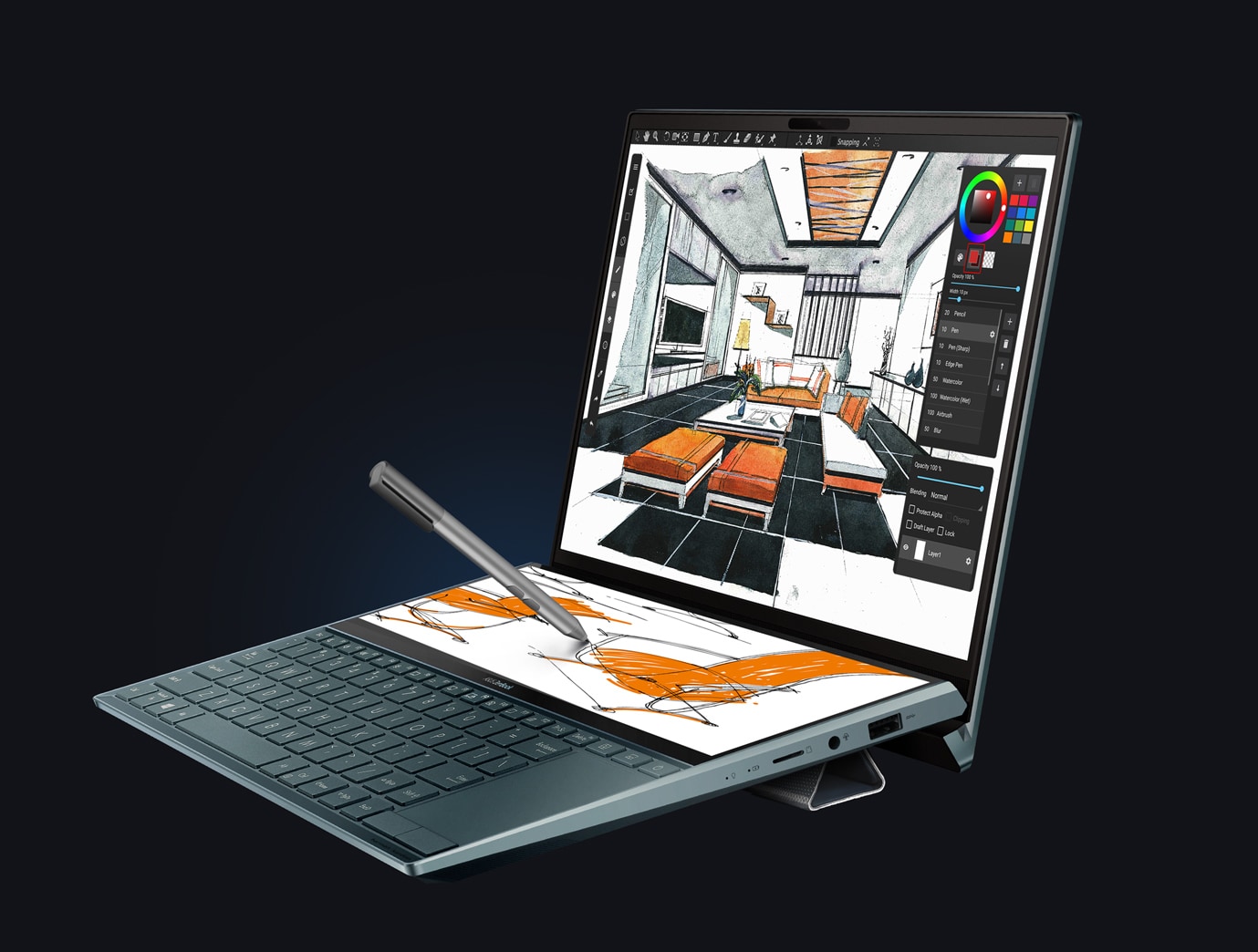 Il produttore ha collaborato con alcuni sviluppatori (es. Corel e Spotify) e determinati programmi sono in grado di avvantaggiarsi per loro natura della presenza dello schermo. In generale è ad ogni modo sempre possibile spostare palette e altri strumenti dei vari software nello schermo inferiore e avere più spazio a disposizione nella parte alta. Cominciamo ad ogni modo dall’inizio e vediamo in dettaglio cosa offre il computer. Il produttore offre (opzionalmente) anche uno stilo con il quale è possibile sfruttare il secondo display per disegnare, prendere appunti, abbozzare idee.