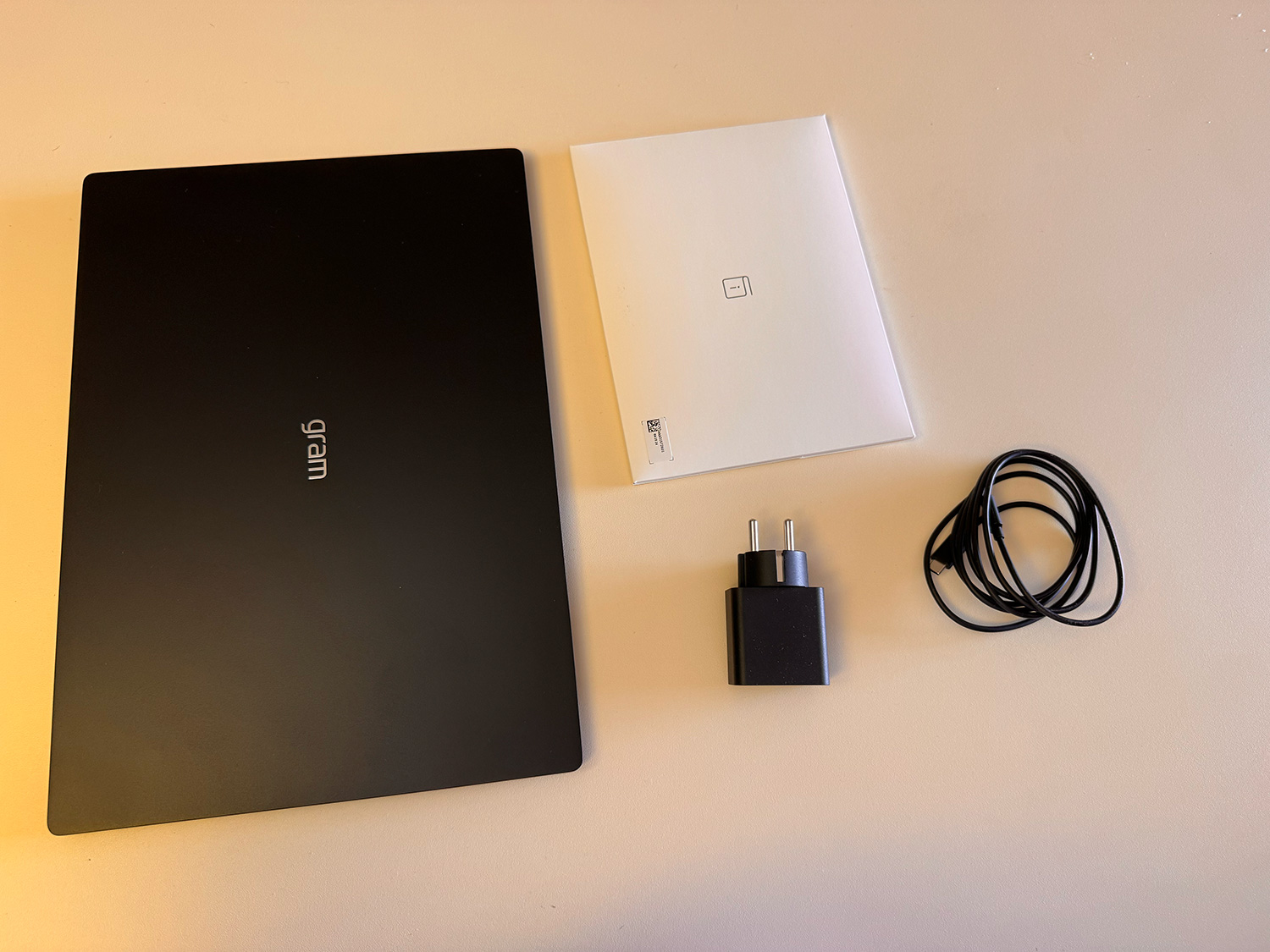 Il notebook arriva all’interno di una scatola di cartone all’interno della quale troviamo il computer vero e proprio (357.7 x 251.6 x 12.4 ~ 12.8 mm), l’alimentatore USB-C (65W con una presa Schuko) e un breve manuale introduttivo.