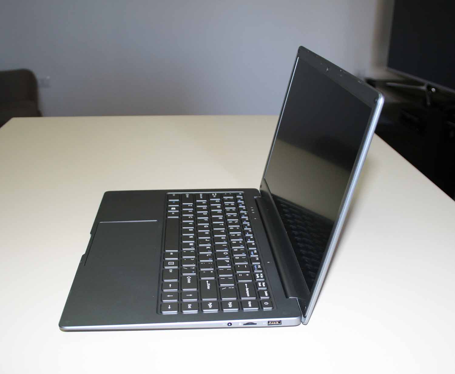 Aprendo il coperchio superiore, sulla sinistra abbiamo l’ingresso dell’alimentatore, una porta USB 3.0 e una mini HDMI; sulla destra abbiamo: uscita audio da 3,5mm, card reader TF e 1 porta USB 2.0. La tastiera (layout USA) è comoda (la digitazione non è rumorosa e i tasti sembrano “morbidi); il touchpad al centro con i poggiapolsi ai lati rende comoda la digitazione e l’utilizzo del trackpad. Sulla parte superiore della tastiera troviamo le varie spie (accensione, caps lock, tastierino numerico e spie doppio microfono).