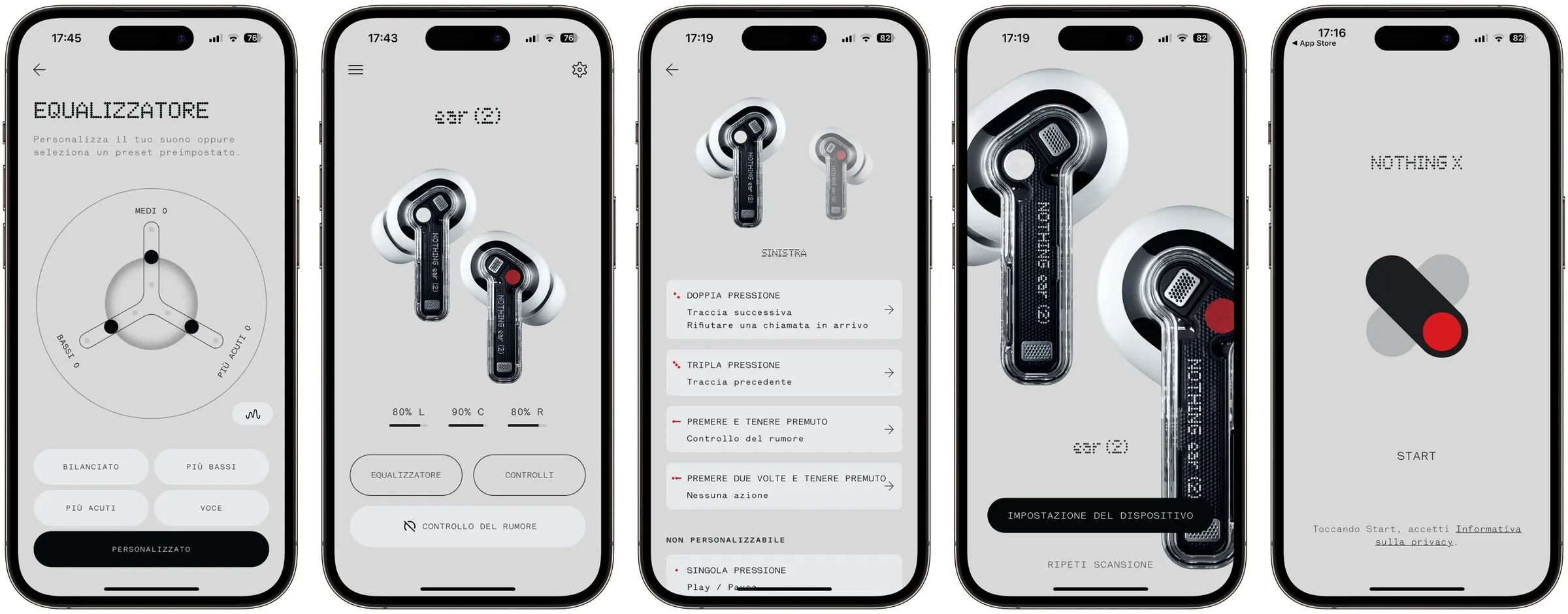 Come abbiamo accennato gli auricolari si fondano per il loro funzionamento su una specifica applicazione, Nothing X (per iOs e per Android). Diciamo subito che senza scaricare l’app, dal punto di vista tecnico e dei contenuti un prodotto sicuramente notevole, non potrete fare nulla in termini di personalizzazione a parte abbinarlo (manualmente su iPhone visto che i Nothng Ear (2) non sono riconosciuti automaticamente come invece accade su Android).