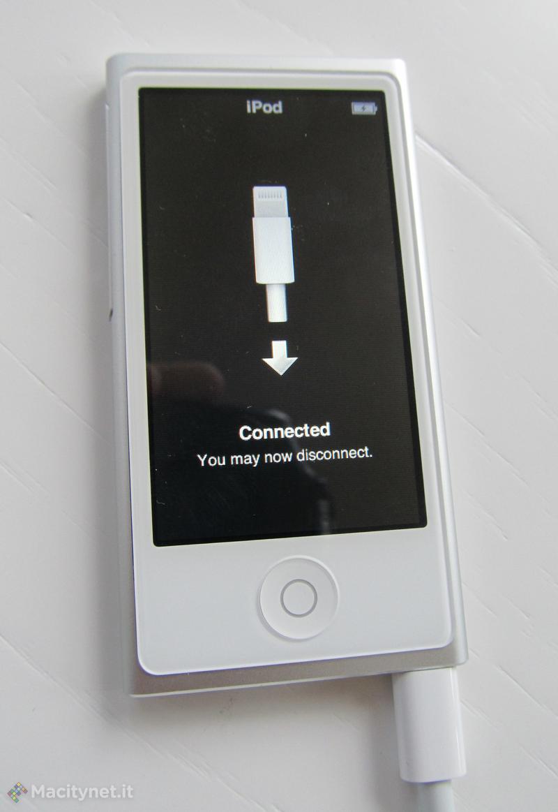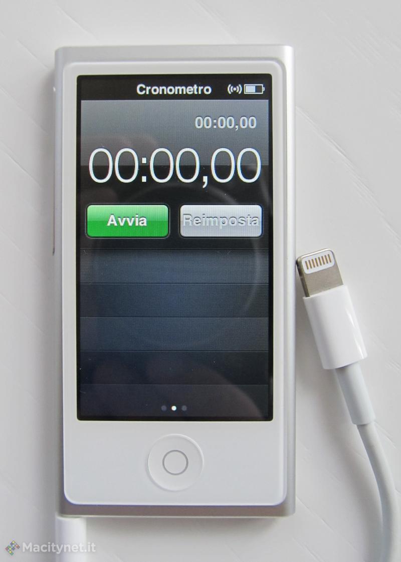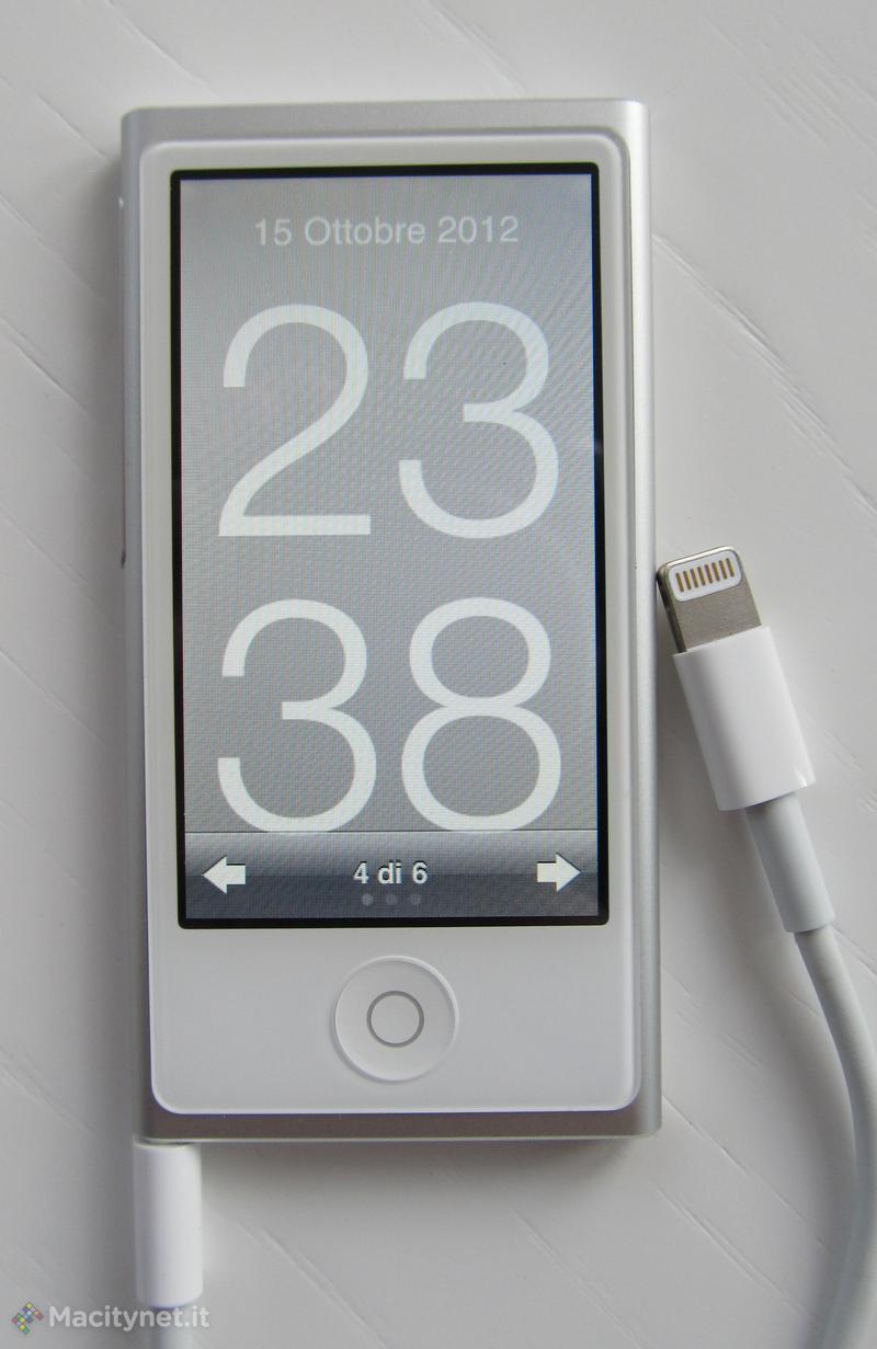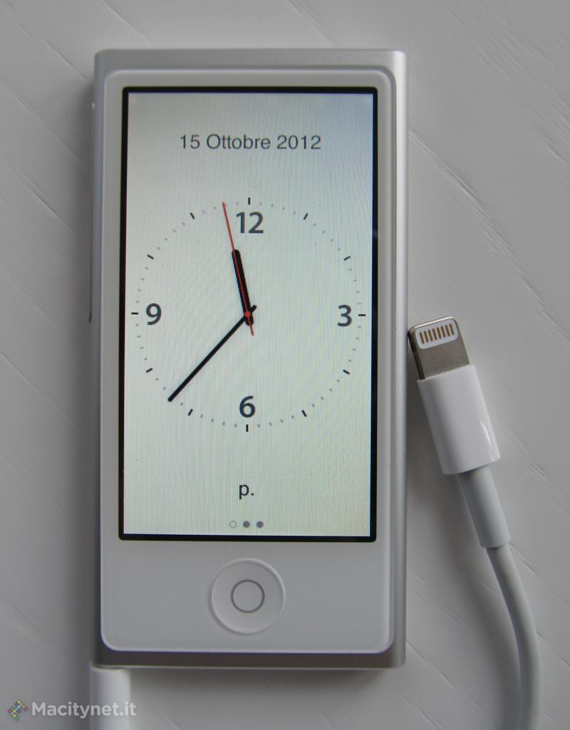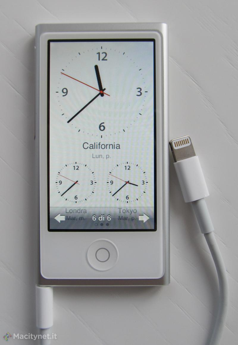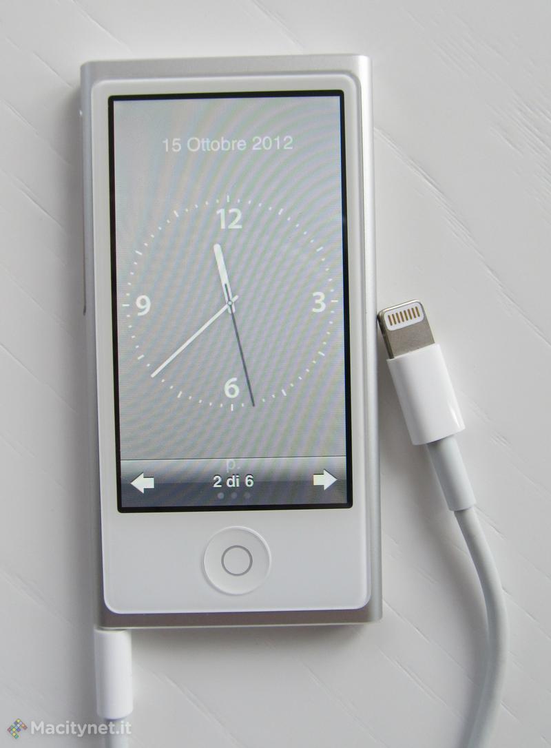 l’iPod nano è molto sottile, tanto sottile da essere meno spesso di un vecchio connettore dock (e questo da solo giustifica l’adozione di Lightning); nonostante l’incremento sensibile delle dimensioni dello schermo, è “solo” due volte più alto del precedente. Preso in mano appare incredibilmente leggero, d’altra parte pesa solo dieci grammi di più del precedente (30 contro 20), un guadagno che ben difficilmente può essere percepito senza l’uso di una bilancia.