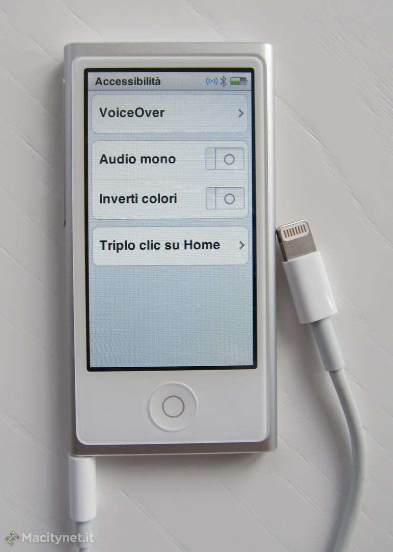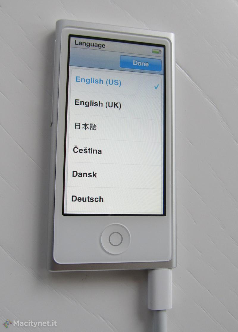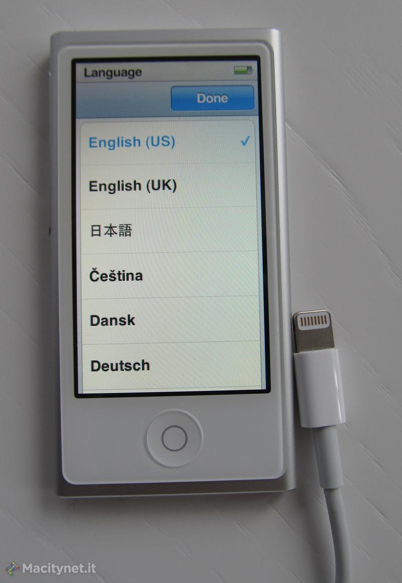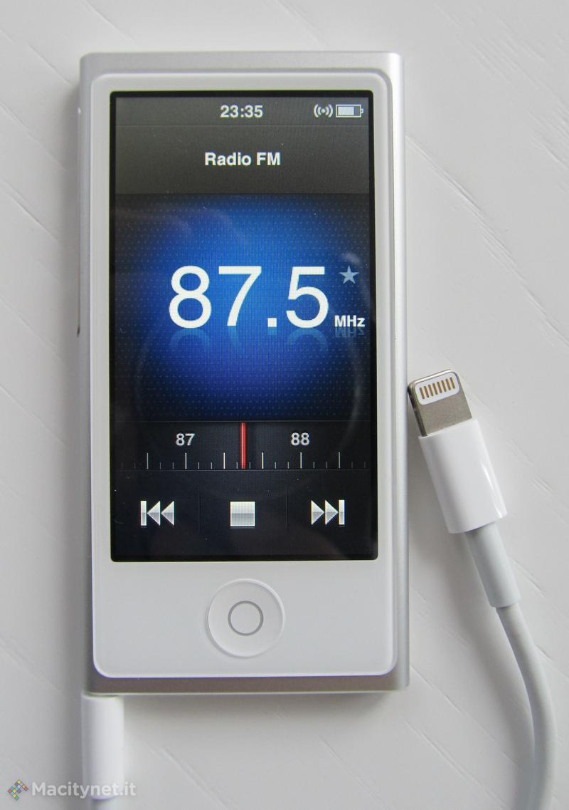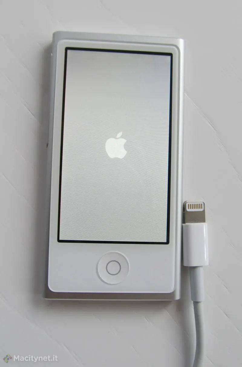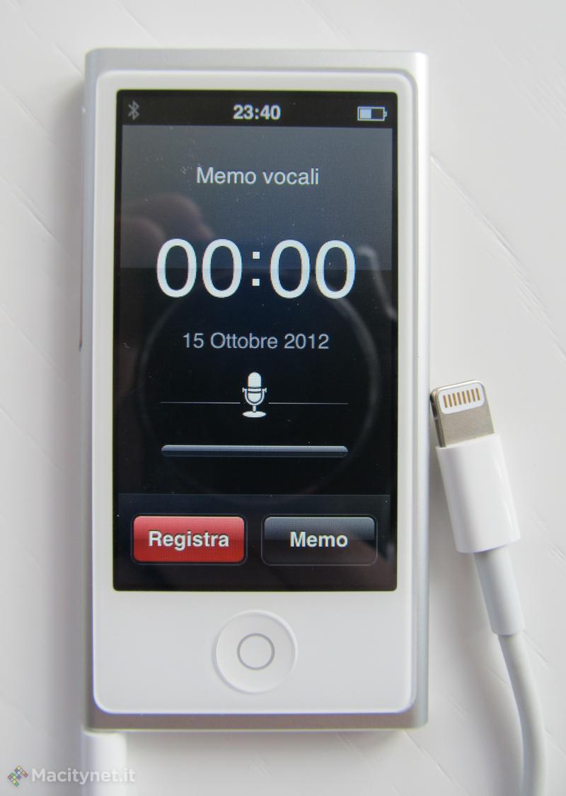 l’iPod nano è molto sottile, tanto sottile da essere meno spesso di un vecchio connettore dock (e questo da solo giustifica l’adozione di Lightning); nonostante l’incremento sensibile delle dimensioni dello schermo, è “solo” due volte più alto del precedente. Preso in mano appare incredibilmente leggero, d’altra parte pesa solo dieci grammi di più del precedente (30 contro 20), un guadagno che ben difficilmente può essere percepito senza l’uso di una bilancia.