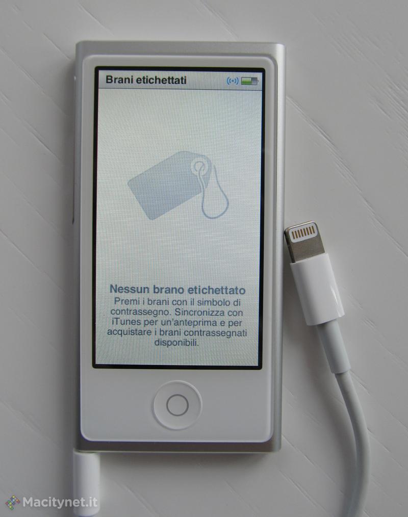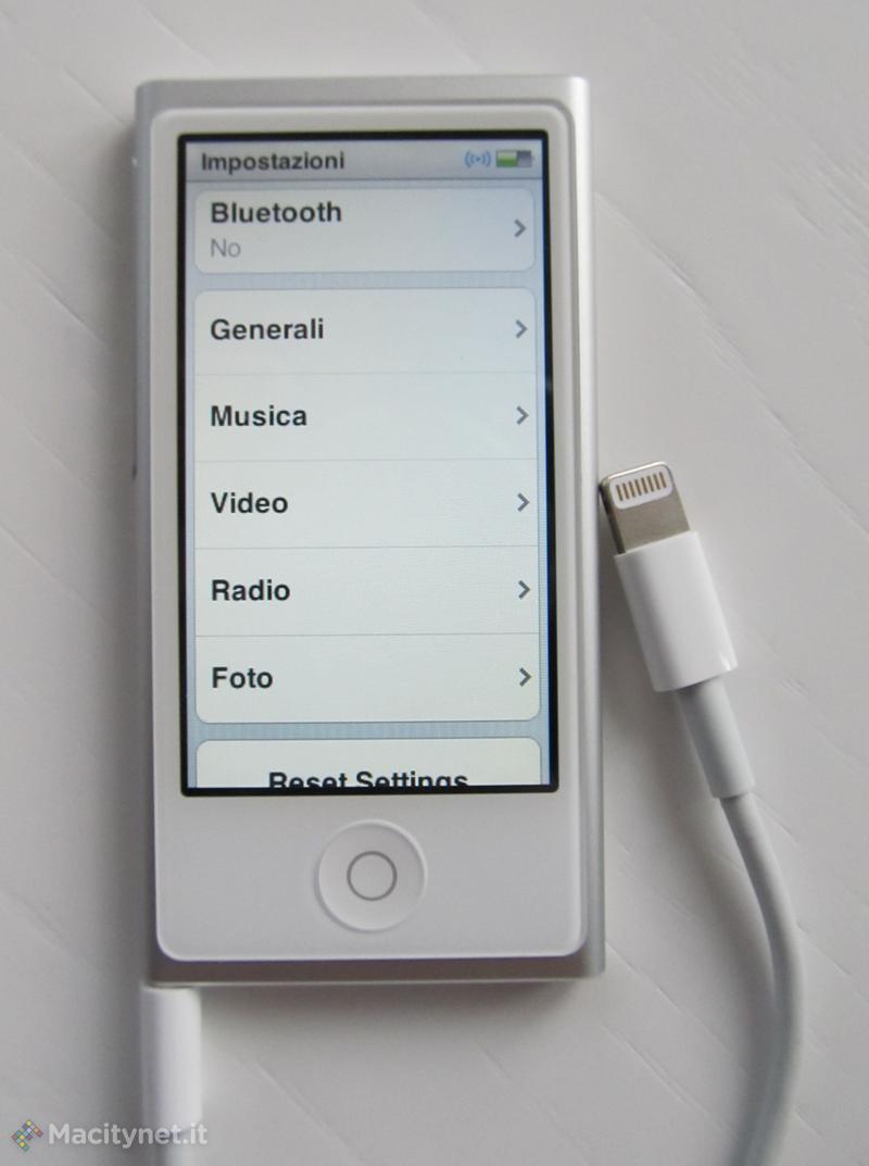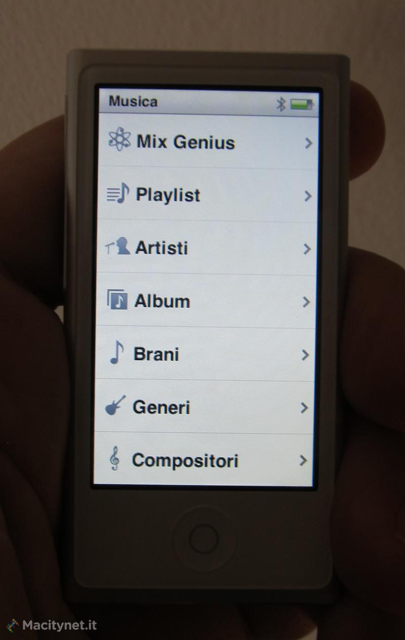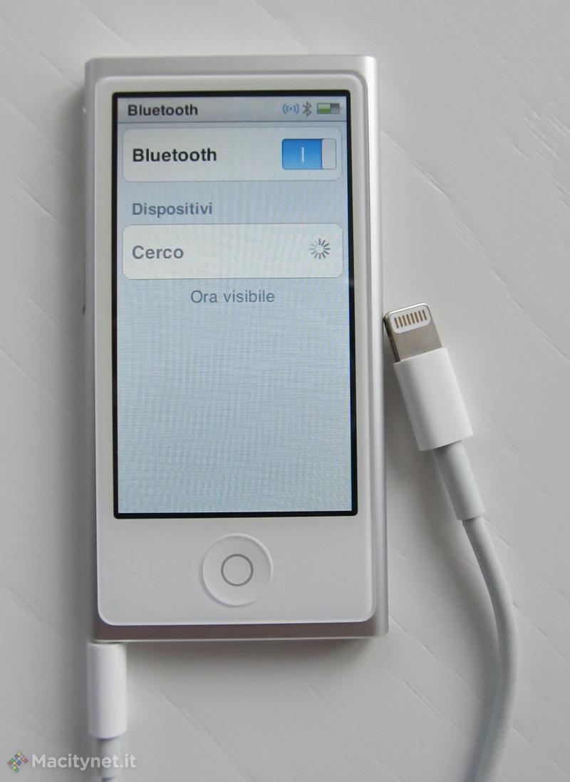 L’iPod nano di settima generazione è il primo ad essere dotato di un sistema di collegamento Bluetooth. Si tratta di una funzione molto importante per chi vuole usare il dispositivo in automobili dotate di Bluetooth o per chi ha a casa uno stereo con questa tecnologia o delle cuffie senza fili. Abbiamo provato il nano con un’auto Mercedes e l’abbinamento è avvenuto senza alcun problema. Il modulo Bluetooth è funzionale anche per altri scopi come ad esempio per un collegamento ad un cardiofrequenzimetro compatibile con Bluetooth 4.0 o tutti i dispositivi compatibili con Nike+. La presenza del Bluetooth fa intuire quanto sarebbe stato utile il Wi-Fi che invece non c’è. Questo esclude la fruizione delle funzioni iCloud (basti pensare a iTunes Match…), l’acquisto di brani da iTunes o per collegare il nano senza fili al computer. La mancanza di questa opzione è dovuta sia a ragioni di costi che, probabilmente, di consumo di batteria che di marketing; la speranza è che in future versioni il Wi-Fi trovi la strada per entrare dentro all’iPod nano moltiplicandone le potenzialità.
