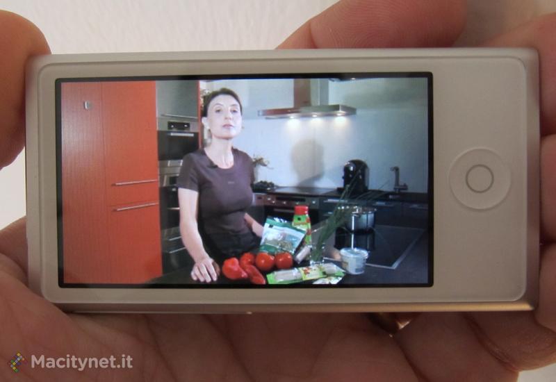 Lo schermo è da 2,5 pollici e passa da 240×240 pixel a 240×432 pixel con 202 pixel per pollice di densità. La risoluzione è rispettabile per un dispositivo che è un player musicale; sufficiente anche la qualità del display che restituisce immagini abbastanza incise dal punto di vista del contrasto e della definizione, anche se non ha certamente lo stesso angolo di visione di un dispositivo come iPhone e iPad nè la stessa fedeltà di colori, ma probabilmente pareggiare in qualità lo schermo di questi prodotti non era quello che aveva in mente Apple quanto ha progettato iPod nano di settima generazione. Quel che contava era aumentare lo spazio a favore della fruibilità del prodotto e dobbiamo dire che lo scopo è stato raggiunto: le icone delle “applicazioni” (virgolette d’obbligo perché non siamo di fronte a vere e proprie app) hanno ora molto più spazio; ne abbiamo sei invece che solo 4 e questo riduce parimenti la necessità di scorrere da uno schermo all’altro; più superficie dello schermo significa che gli elementi visibili sullo schermo quando si è in una playlist sono sette invece di tre del precedente nano. Infine abbiamo anche l’orologio in alto di ogni schermata; l’ora era sparita dalla versione precedente per mancanza di spazio.