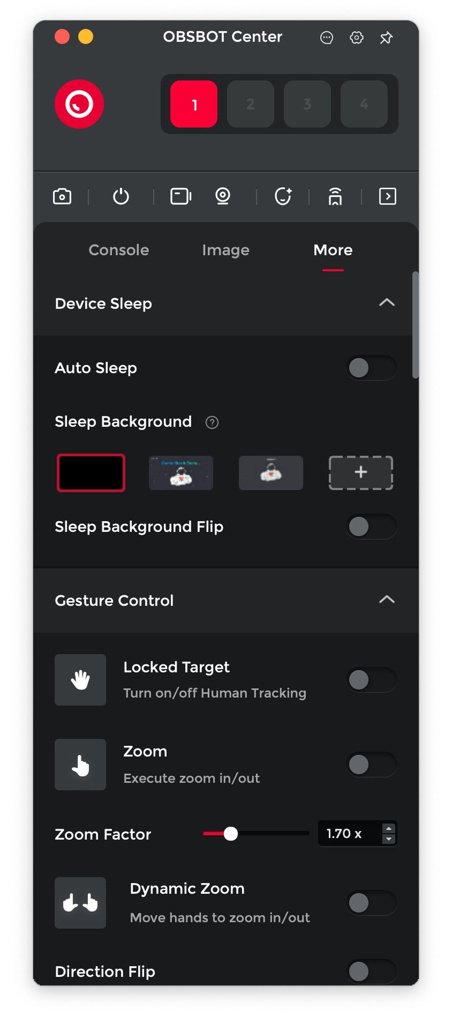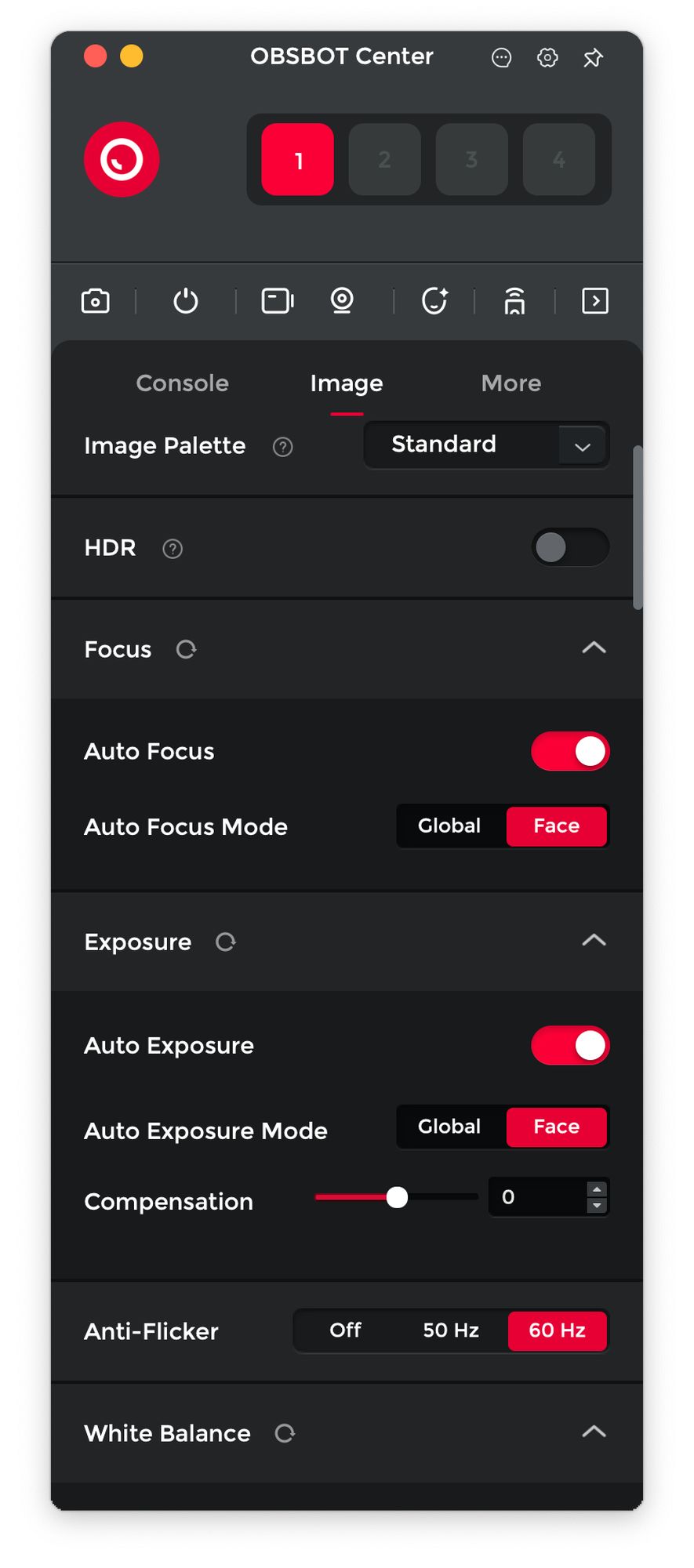 Il software OBSBOT Center fa molto altro, ad esempio attiva un riquadro per provare la fotocamera (e per fortuna, perché macOS non ha app per il controllo, a parte la vetusta Photo Boot), ma attiva anche un sistema integrato per il ritocco dell’immagine in tempo reale, attivando l’HDR, migliorando l’esposizione e l’autofocus, il punto di bianco e le regolazioni colore, tutte funzioni accessorie che l’utente può attivare e regolare senza problemi in qualunque momento.
