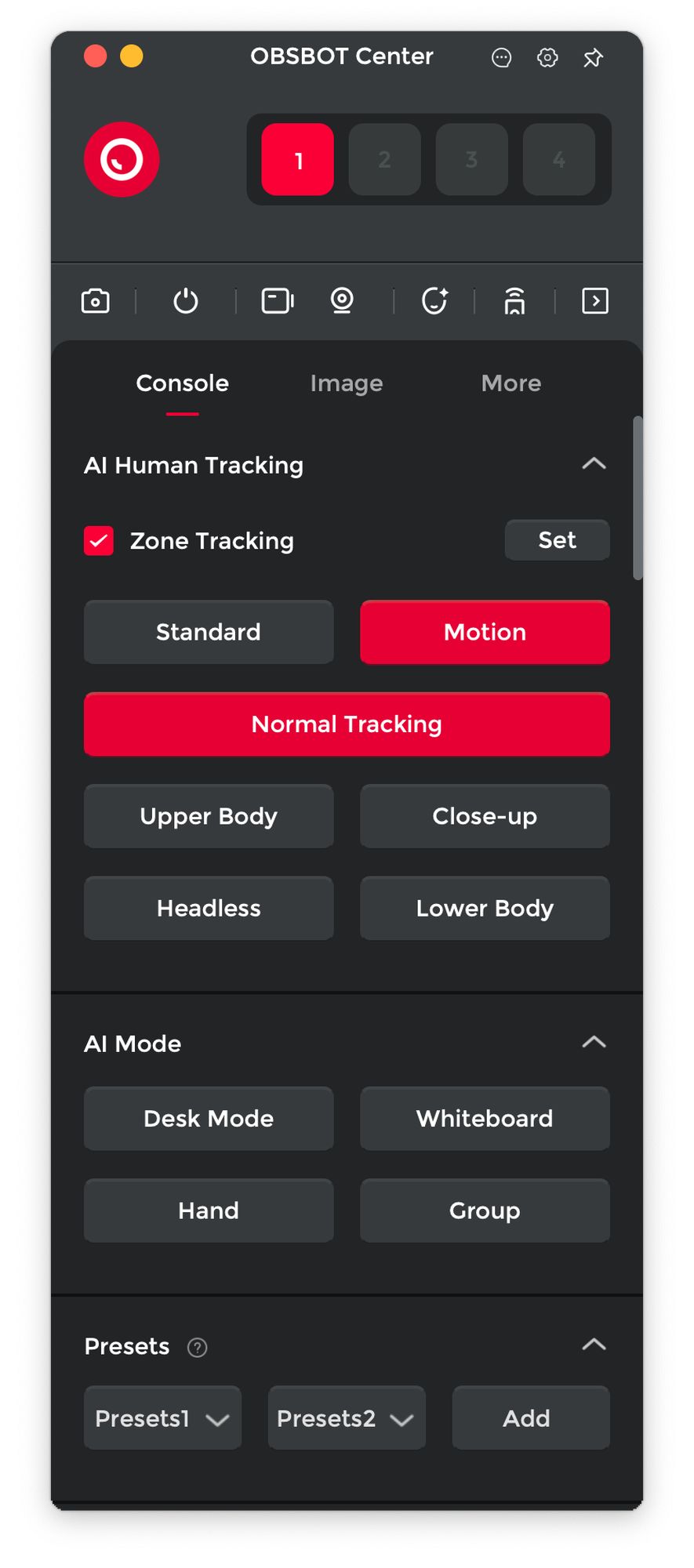 Infine, se avete più di una camera OBSBOT, il software le riconosce e vi permette di creare delle stanze, per passare in modo semplice da una inquadratura all’altra tramite un semplice comando, potendo quindi gestire una intera regia multicamera (preparata offline) anche da soli.
