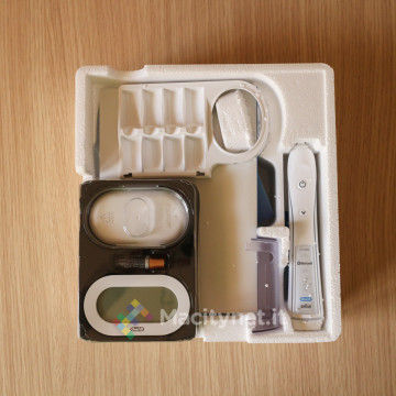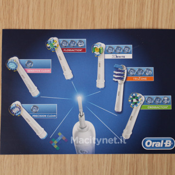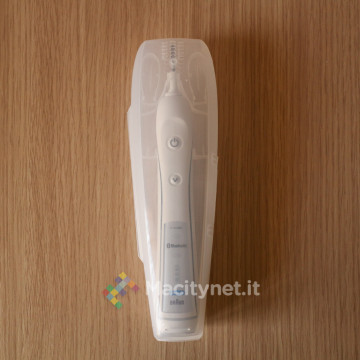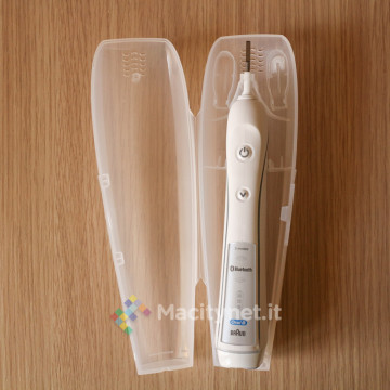 Inclusi nella confezione ci sono infatti 4 spazzolini (CrossAction, 3DWhite, FlossAction e Sensitive Clean) anziché 5, nulla di grave visto che il quinto che troviamo nella scatola del Pro 7000 non è altro che una doppia-copia del modello CrossAction. Oltre a questo manca la sacca per il trasporto della base di ricarica mentre la custodia da viaggio, che nel Pro 7000 è in versione premium, qui è offerta in un modello più basilare ma pur sempre efficiente, trattandosi di una custodia rigida in plastica di ottima qualità semi-trasparente che tiene ben fermi e protetti manico e due spazzolini.
