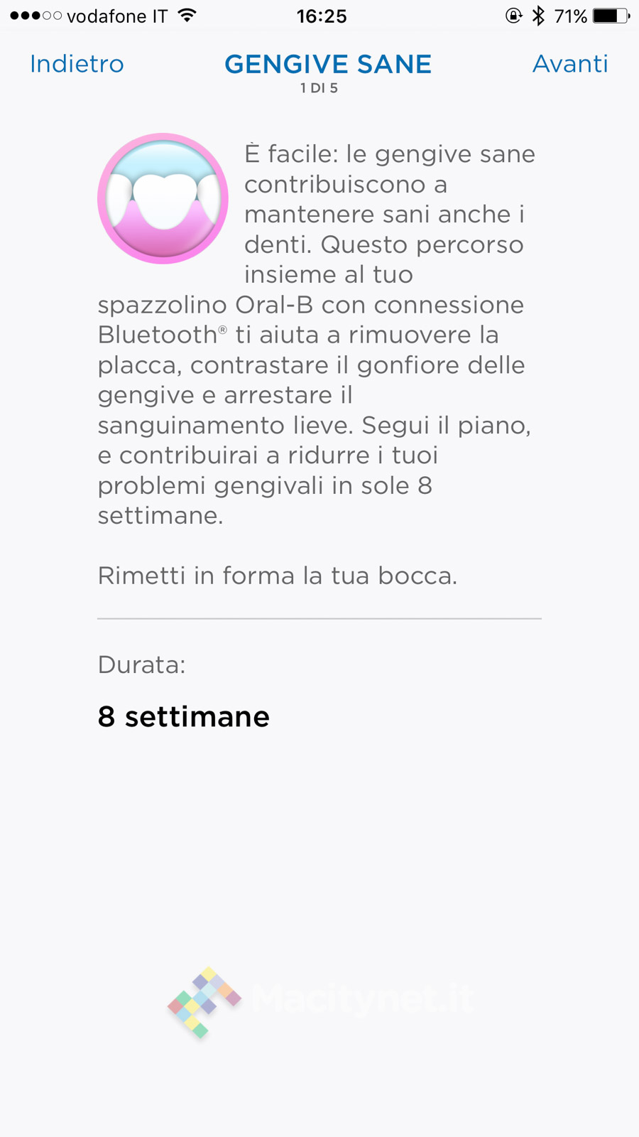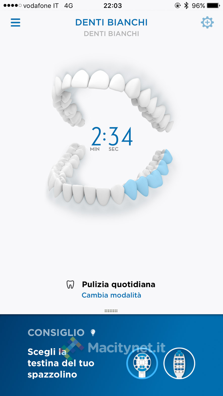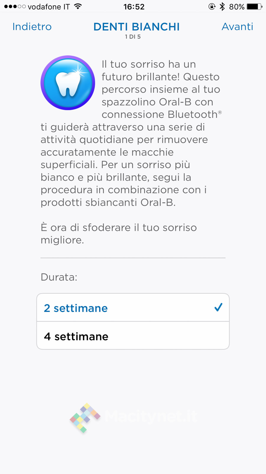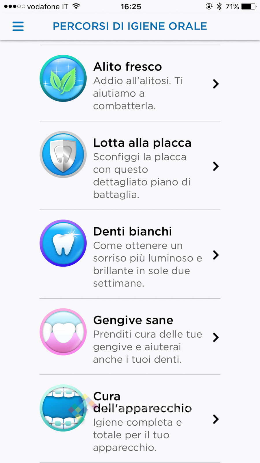 Soltanto attraverso l’applicazione è possibile selezionare uno dei vari percorsi disponibili (Alito fresco, Lotta alla placca, Denti bianchi, Gengive sane, Cura dell’apparecchio) che prevedono durate, spazzolini e modalità di spazzolamento differenti.