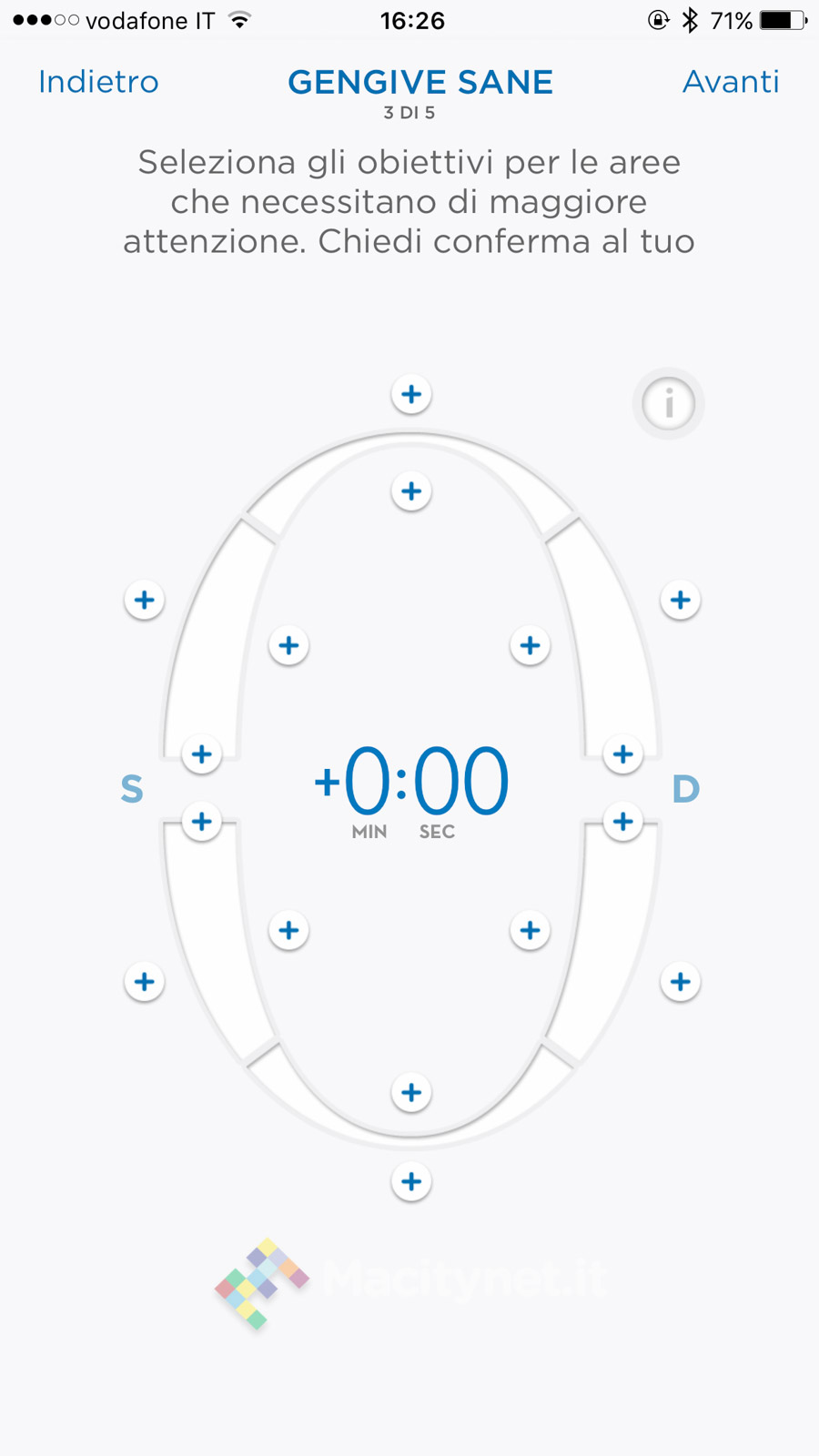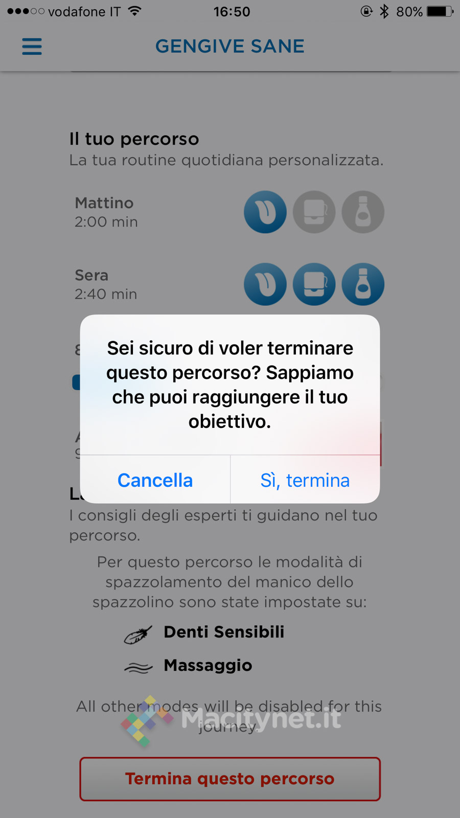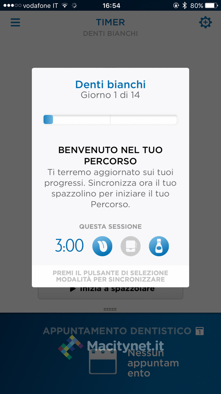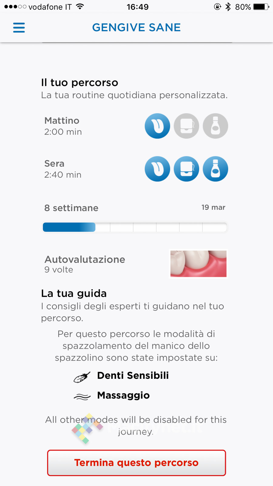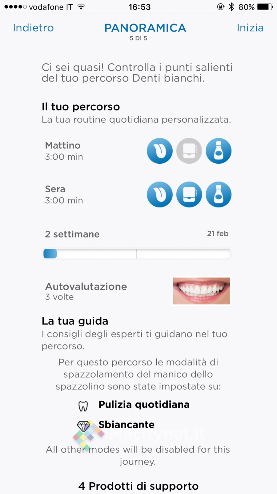 Soltanto attraverso l’applicazione è possibile selezionare uno dei vari percorsi disponibili (Alito fresco, Lotta alla placca, Denti bianchi, Gengive sane, Cura dell’apparecchio) che prevedono durate, spazzolini e modalità di spazzolamento differenti.