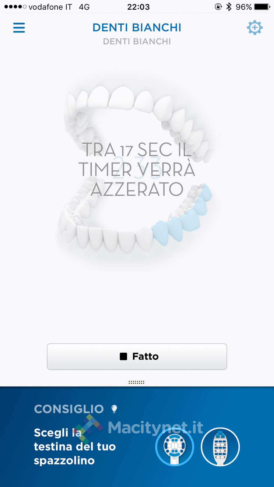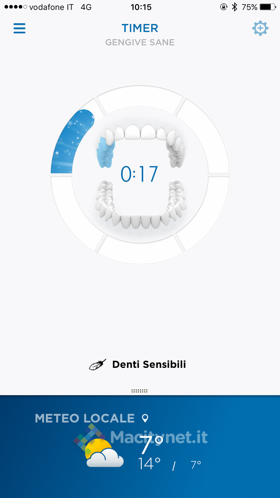 Il vero punto di forza di Oral-B Pro 6000 (e 7000) sta però nell’uso con lo smartphone abbinato al seguito. Qui, oltre ad avere un duplicato del timer, verrà mostrata l’area da spazzolare di volta in volta, oltre ad una serie di informazioni racchiuse in un banner inferiore per intrattenersi con notizie, meteo, curiosità e quant’altro.