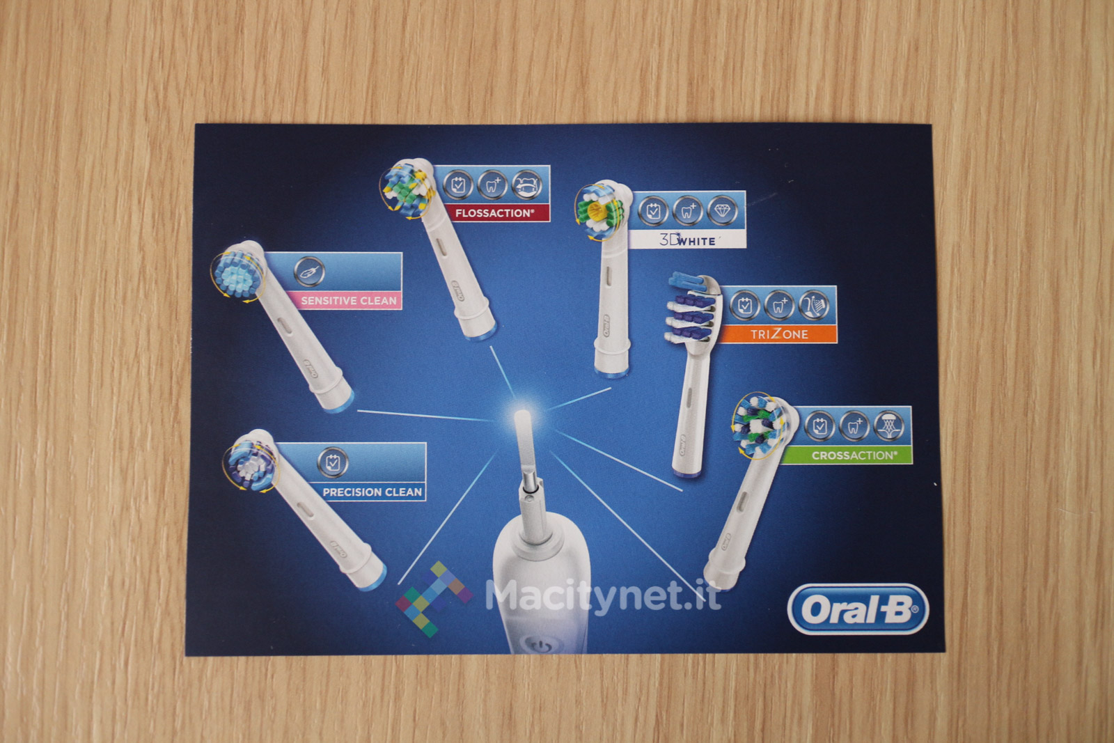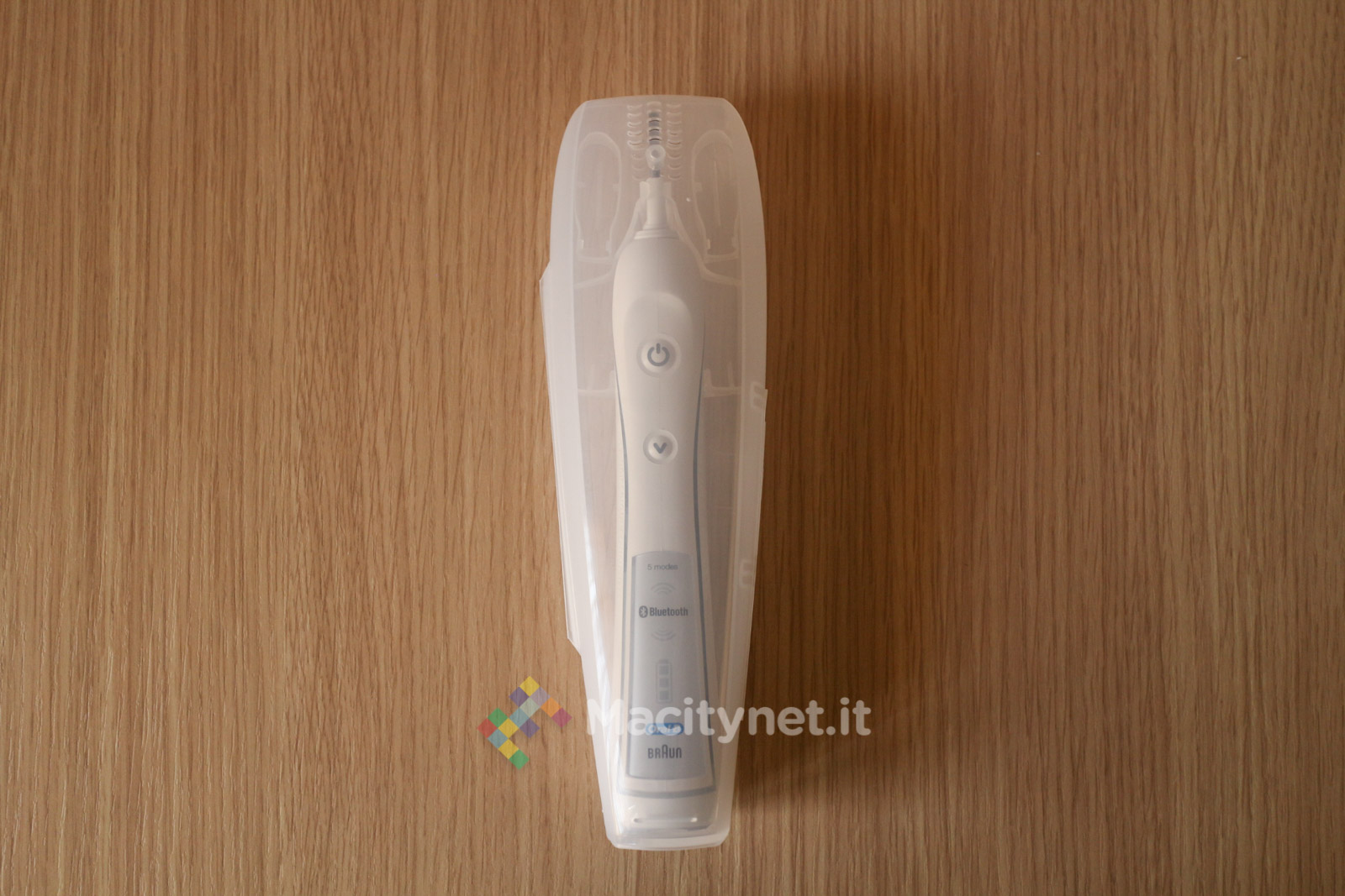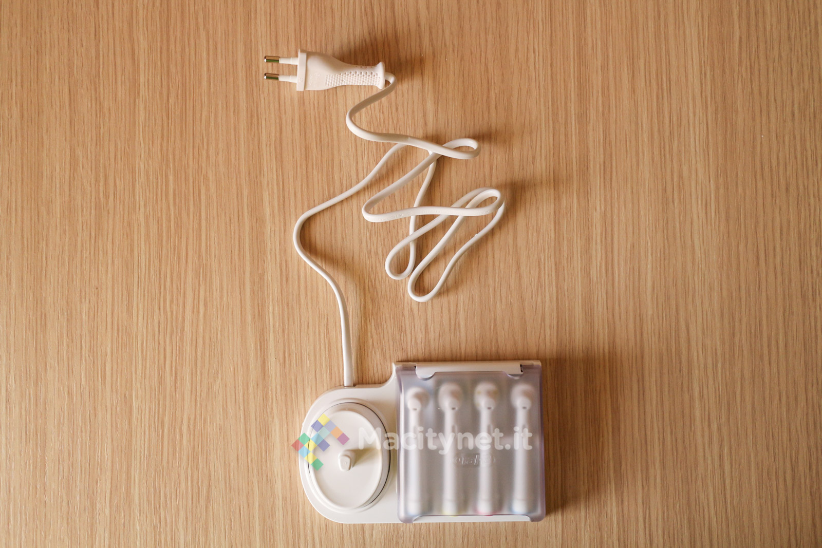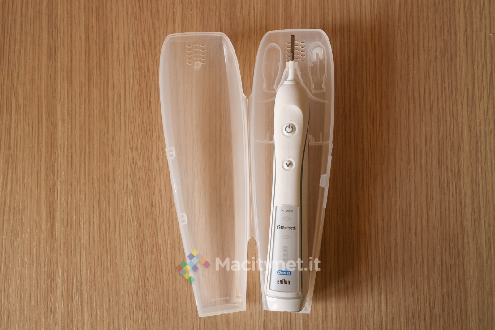 Inclusi nella confezione ci sono infatti 4 spazzolini (CrossAction, 3DWhite, FlossAction e Sensitive Clean) anziché 5, nulla di grave visto che il quinto che troviamo nella scatola del Pro 7000 non è altro che una doppia-copia del modello CrossAction. Oltre a questo manca la sacca per il trasporto della base di ricarica mentre la custodia da viaggio, che nel Pro 7000 è in versione premium, qui è offerta in un modello più basilare ma pur sempre efficiente, trattandosi di una custodia rigida in plastica di ottima qualità semi-trasparente che tiene ben fermi e protetti manico e due spazzolini.